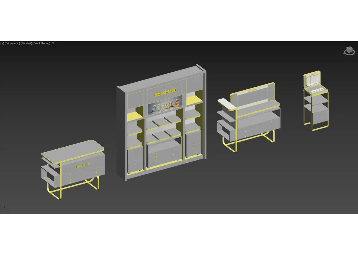 Our editable 3D model interior scene is compatible with 3ds Max and rendered with Corona Renderer, ensuring high-quality renders and seamless integration into your workflow.Textures and materials are included, allowing for effortless customization and rendering.Elevate your retail experience with our luxury brand permanent merchandising kiosk gondola design 3D model interior scene. Whether you're designing a high-end boutique, luxury pop-up shop, or exclusive retail space, our versatile asset offers the perfect combination of style, sophistication, and prestige to showcase premium fashion, accessories, and jewelry from the world's most iconic brands.