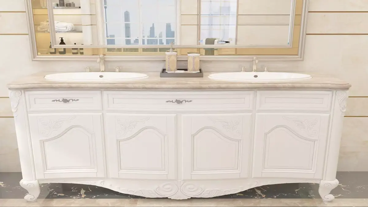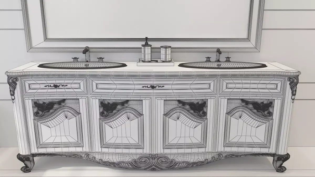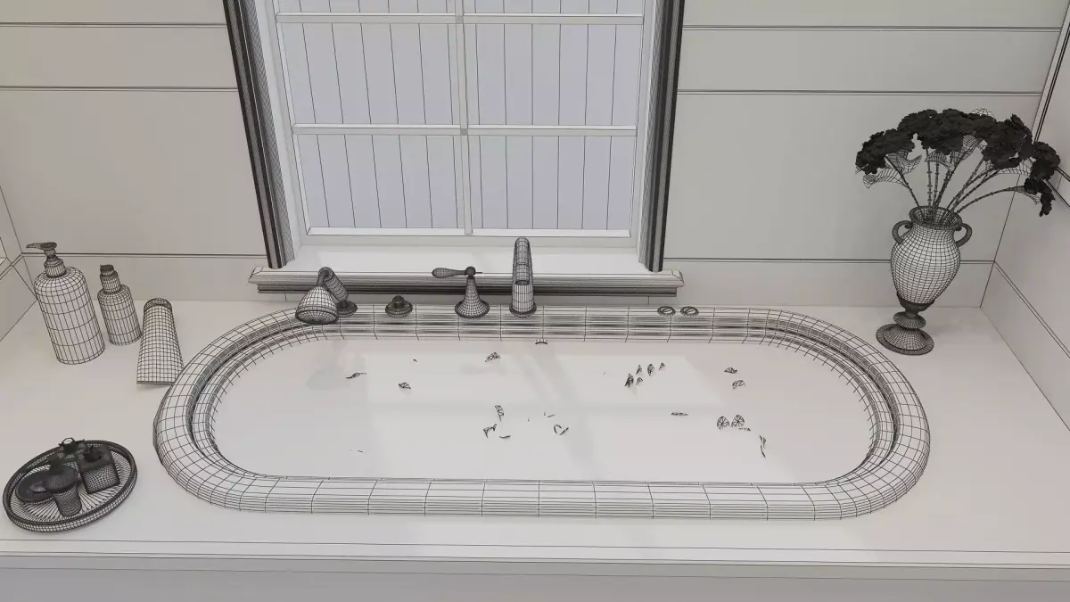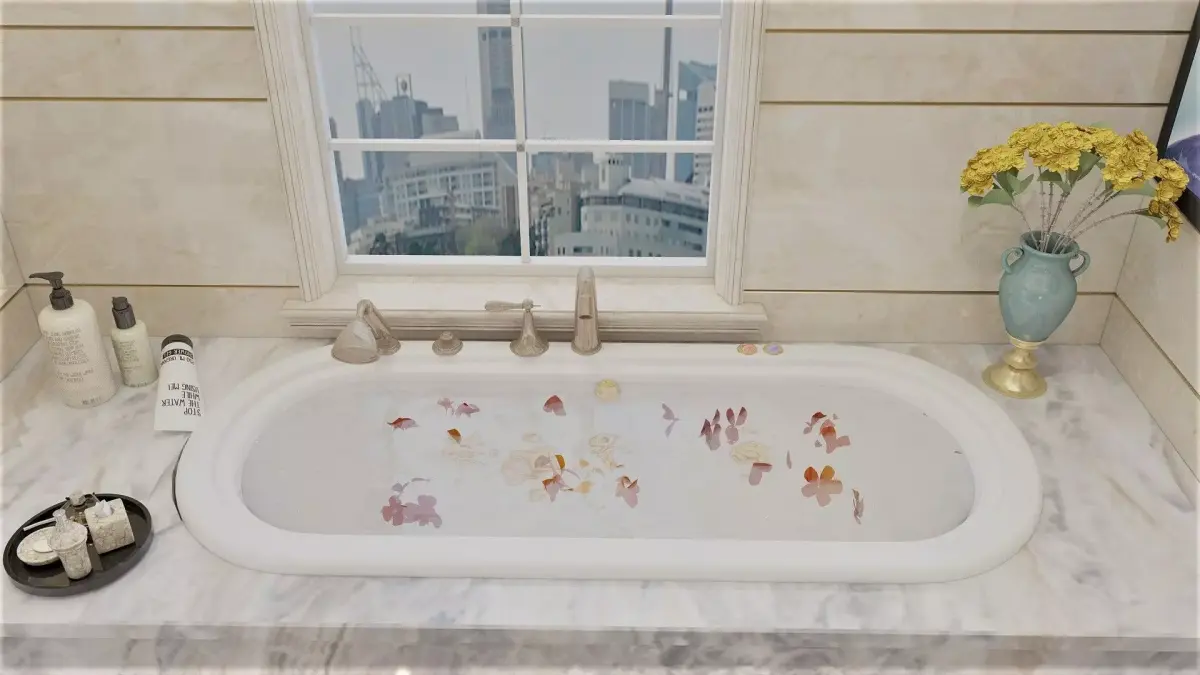 Interior scene of a fully furnished and decorated bathroom in Empire style with bathtub, shower and toilet fixtures.