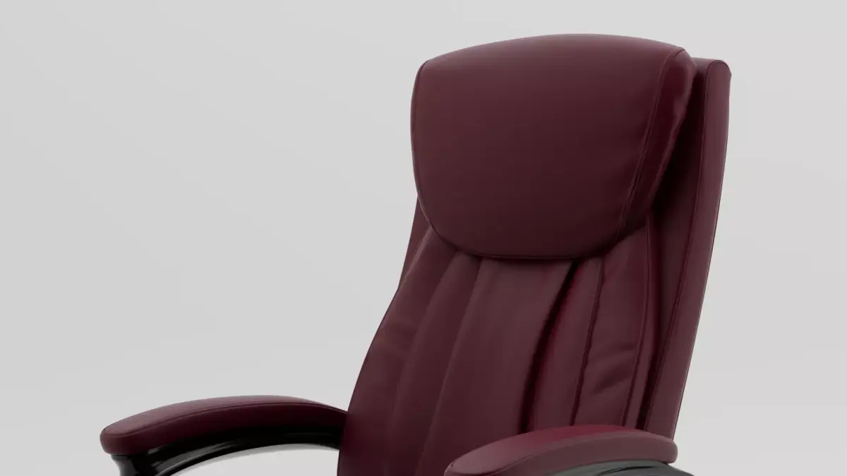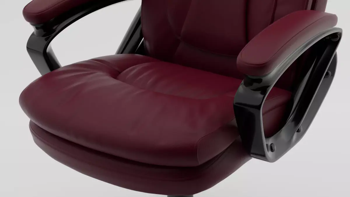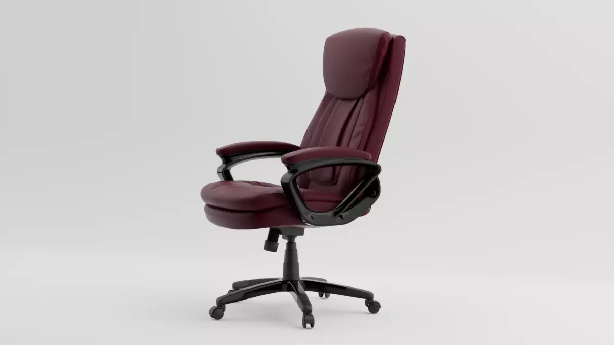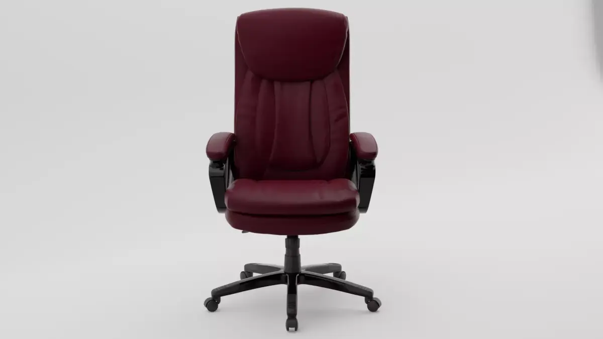 Elegant high-back executive chair in deep burgundy/oxblood genuine leather with vertical stitching, padded armrests and matte black 5-star base. PBR 4K textures, clean topology – perfect for luxury offices, law firms and premium archviz.