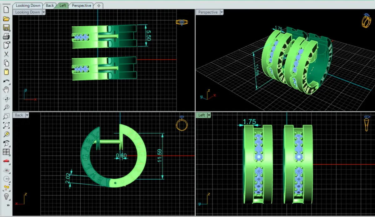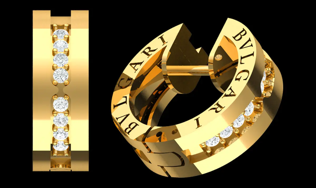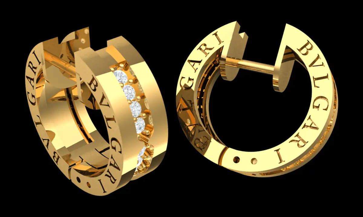 High-poly 3D model of premium hoop earrings. Featuring engraved BVLGARI branding, intricate gold finishes, and a dazzling inset of gemstones. Ideal for jewelry design visualization, rendering, or 3D printing projects. Ready for customization.