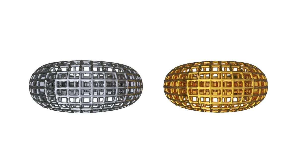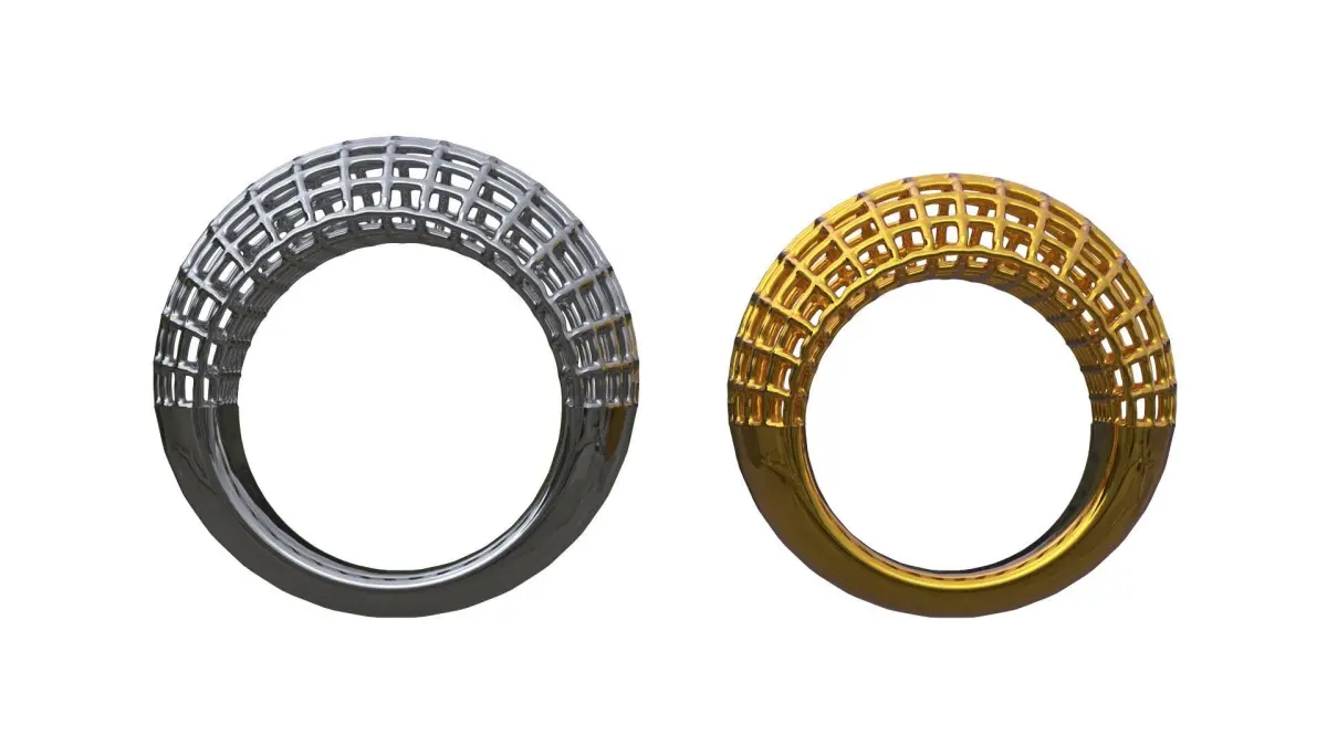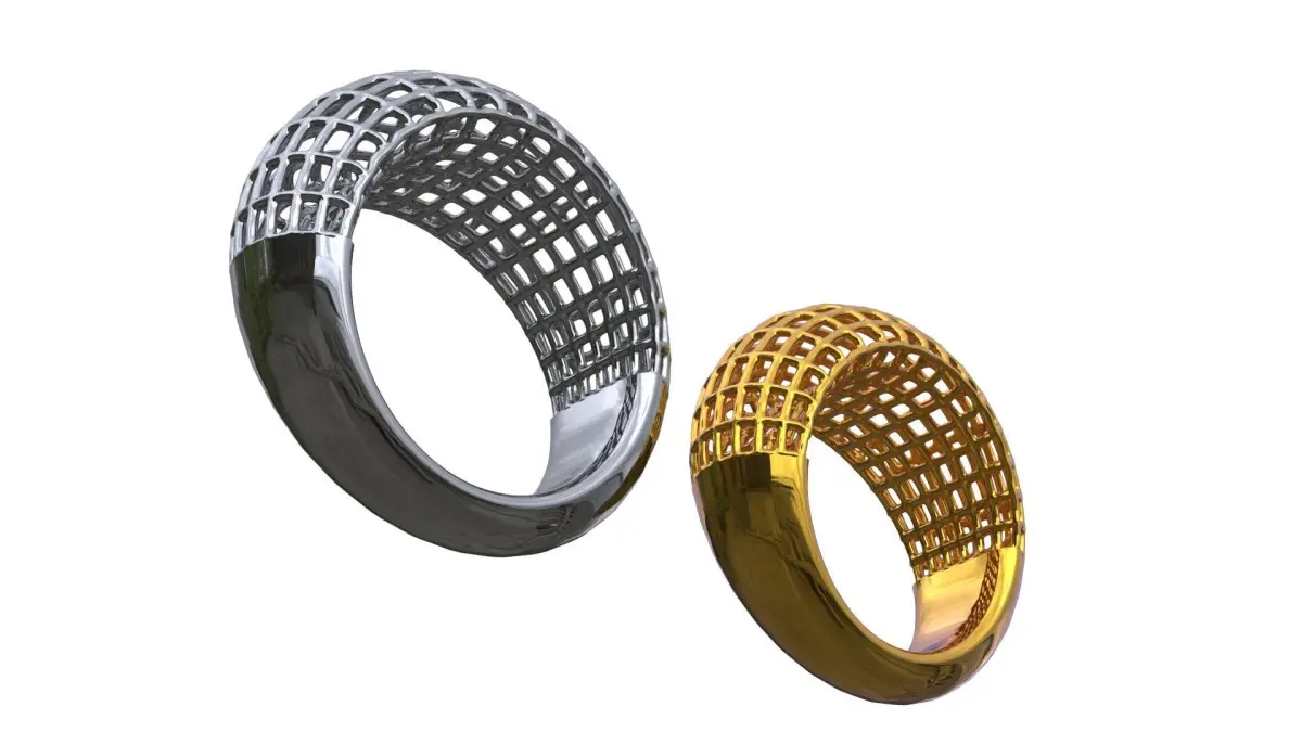 Two Rings with rectangular Polygonal Cage Pattern on upper half of each model, The two Rings are identical with different inner finger diameters, the models were created using computational parametric tools to achieve the most accurate geometry with clean details, it could be used for 3d printing as a fashion accessory and wearable, it suits most of fingers sizes for easy wear and not to be uncomfortably tight on fingers, the designs are unique and suits the modern fashion era of digital fabrication, cyber style, generative design and scifi conceptual art designs.