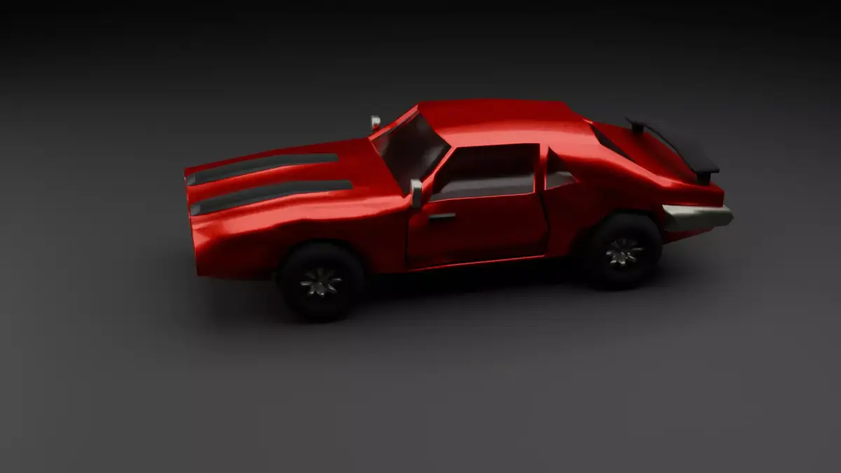 Realistic Materials: Created and rendered in Blender, the model utilizes advanced PBR (Physically Based Rendering) materials. The deep metallic red flake paint reacts dynamically to light, contrasted by matte black racing stripes and high-quality trim materials for the bumpers and glass.