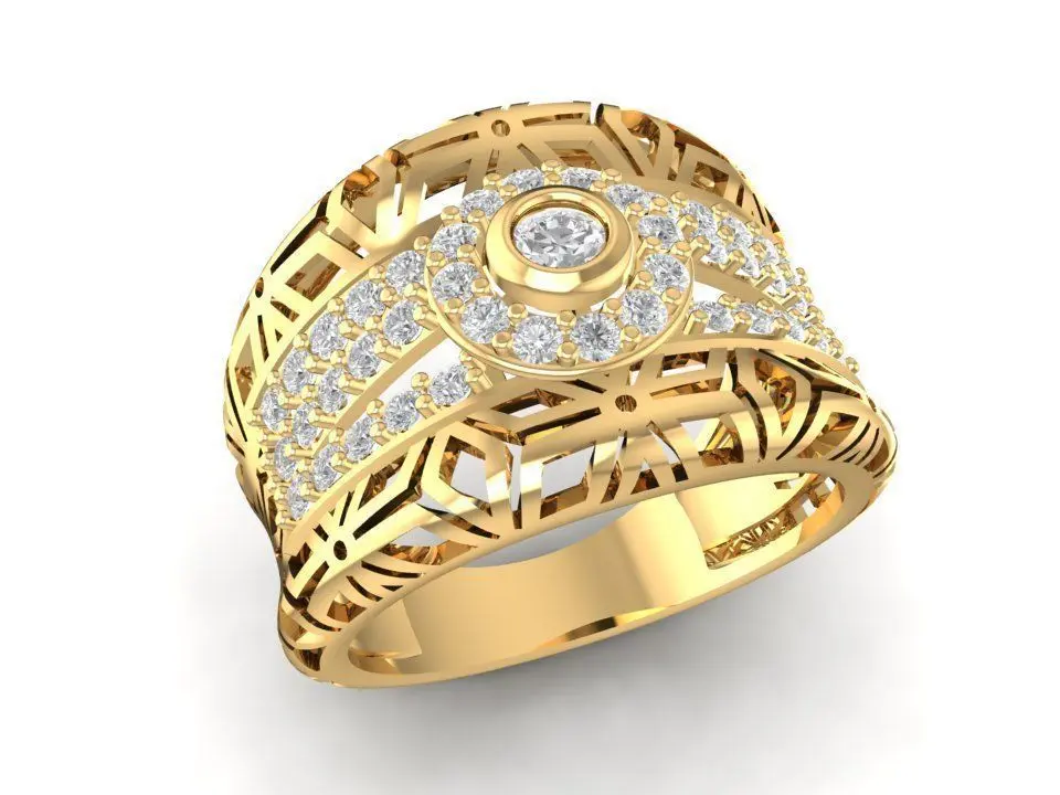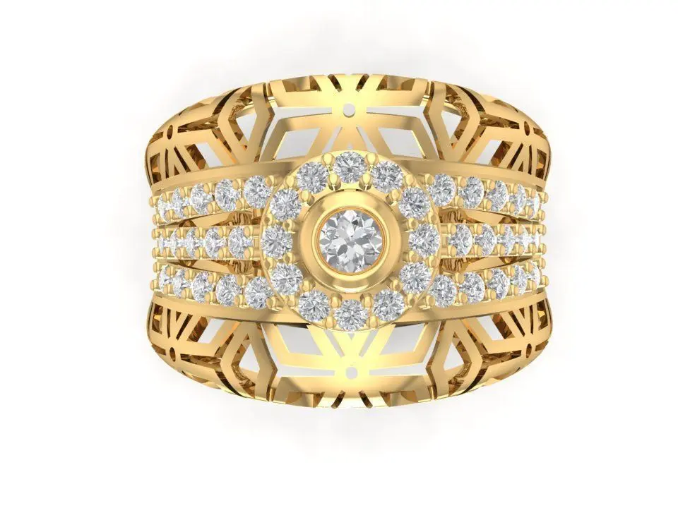 This 3D model presents a luxury carved wide diamond band ring for men, designed with an elegant and powerful aesthetic. The band features intricate openwork details combined with a central round diamond accent and additional pavé-set stones for extra brilliance.