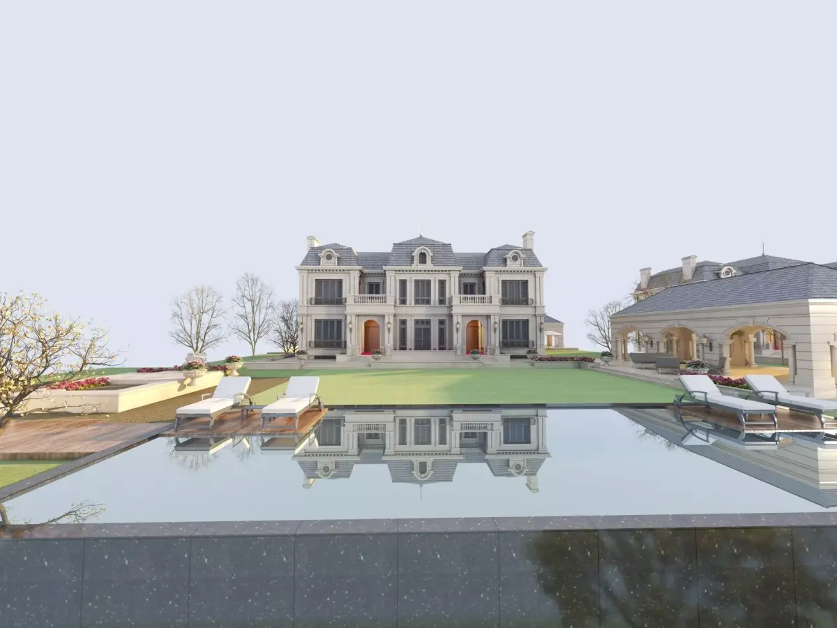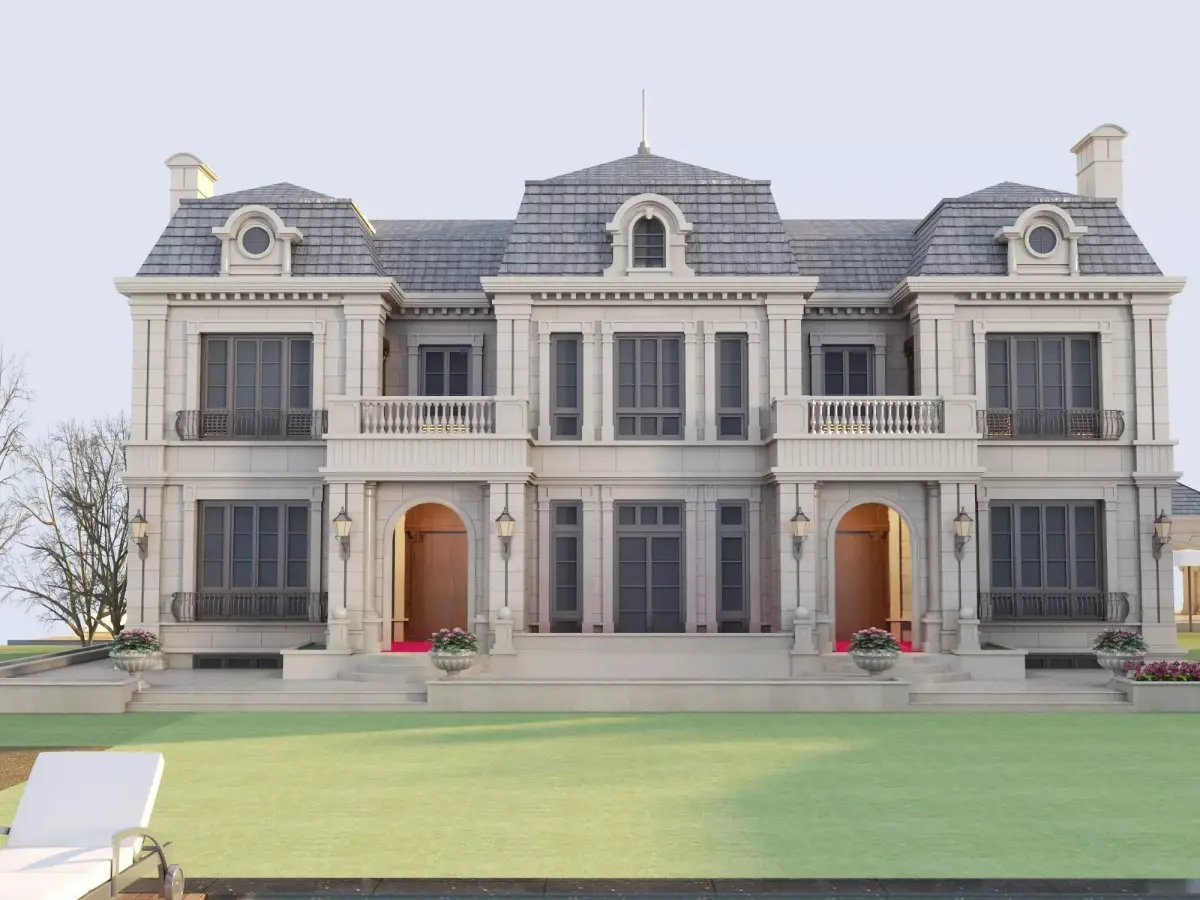 This elegant 3D model showcases a magnificent castle-like mansion, featuring symmetrical stone facades adorned with exquisite columns, arched porticoes, and large multi-panel windows. Design highlights include: a slate pitched roof with dormer windows and chimneys, an upper-level balcony with delicate railings, wall-mounted lanterns, and a stepped entrance decorated with potted plants. The building's exterior complements the neatly manicured green lawn, further enhancing the estate's luxurious grandeur. This model is ideal for architectural visualization, real estate rendering, game environments, or luxury property simulations. The model includes high-resolution textures for stone, wood, glass, and landscape elements.