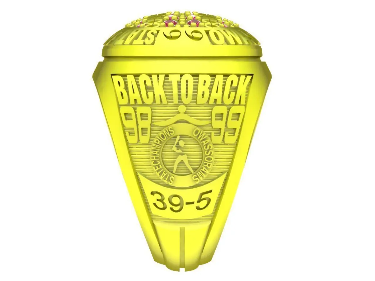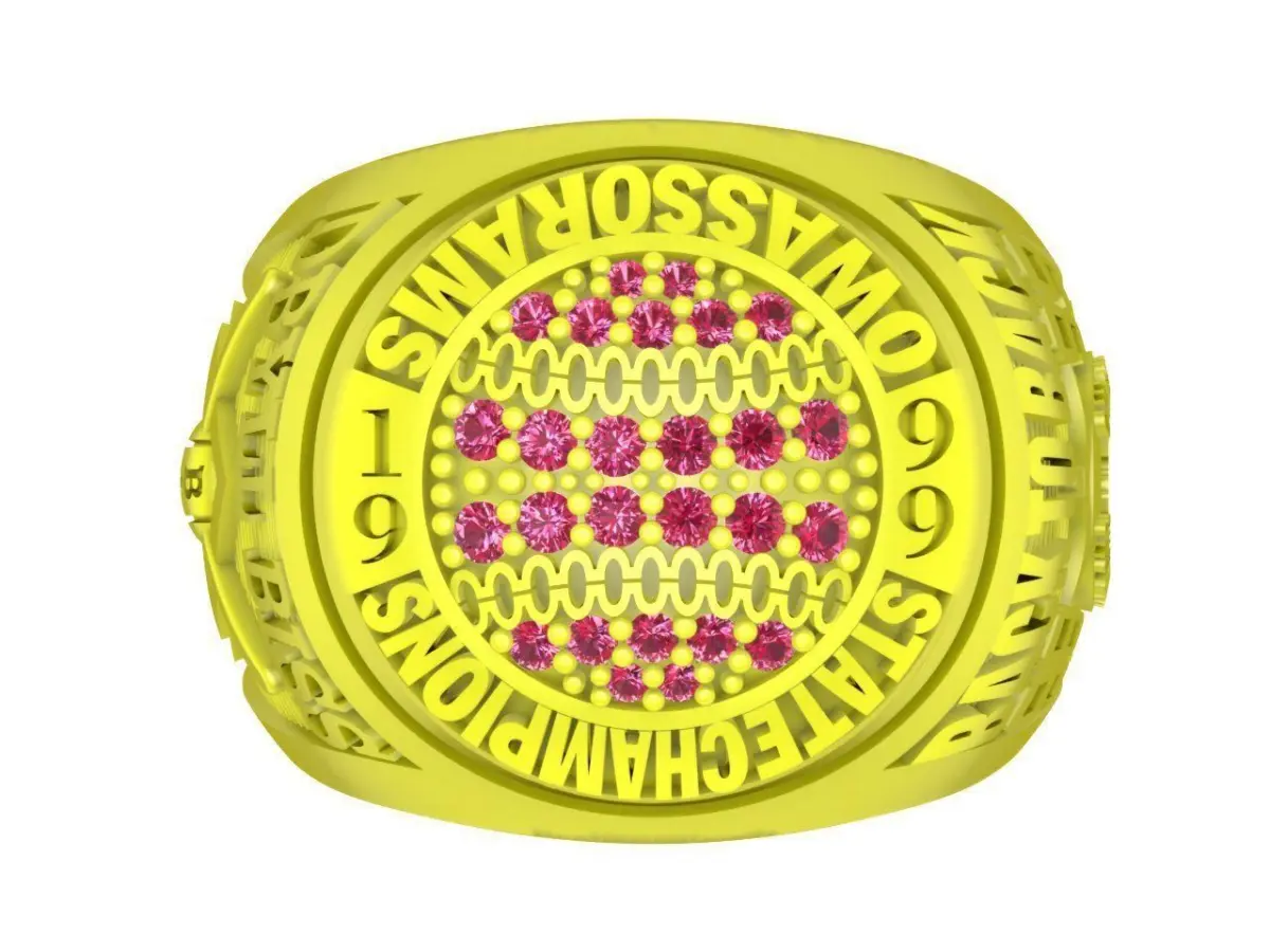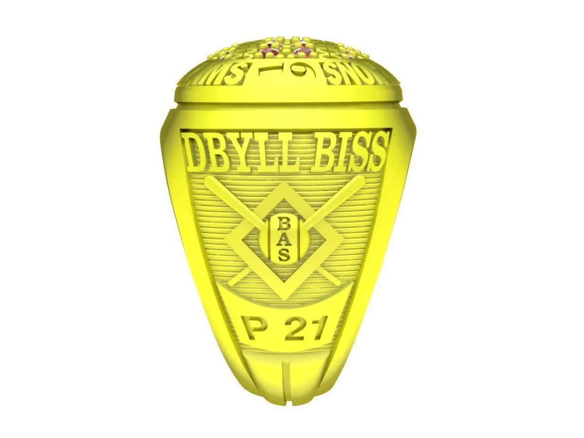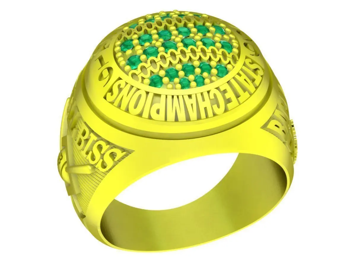 This luxury championship class ring 3D model is designed with a bold and iconic structure, inspired by traditional American class and championship rings. The ring features a raised oval top with pavé stone settings, surrounded by engraved text and symbolic elements that emphasize achievement, pride, and recognition.