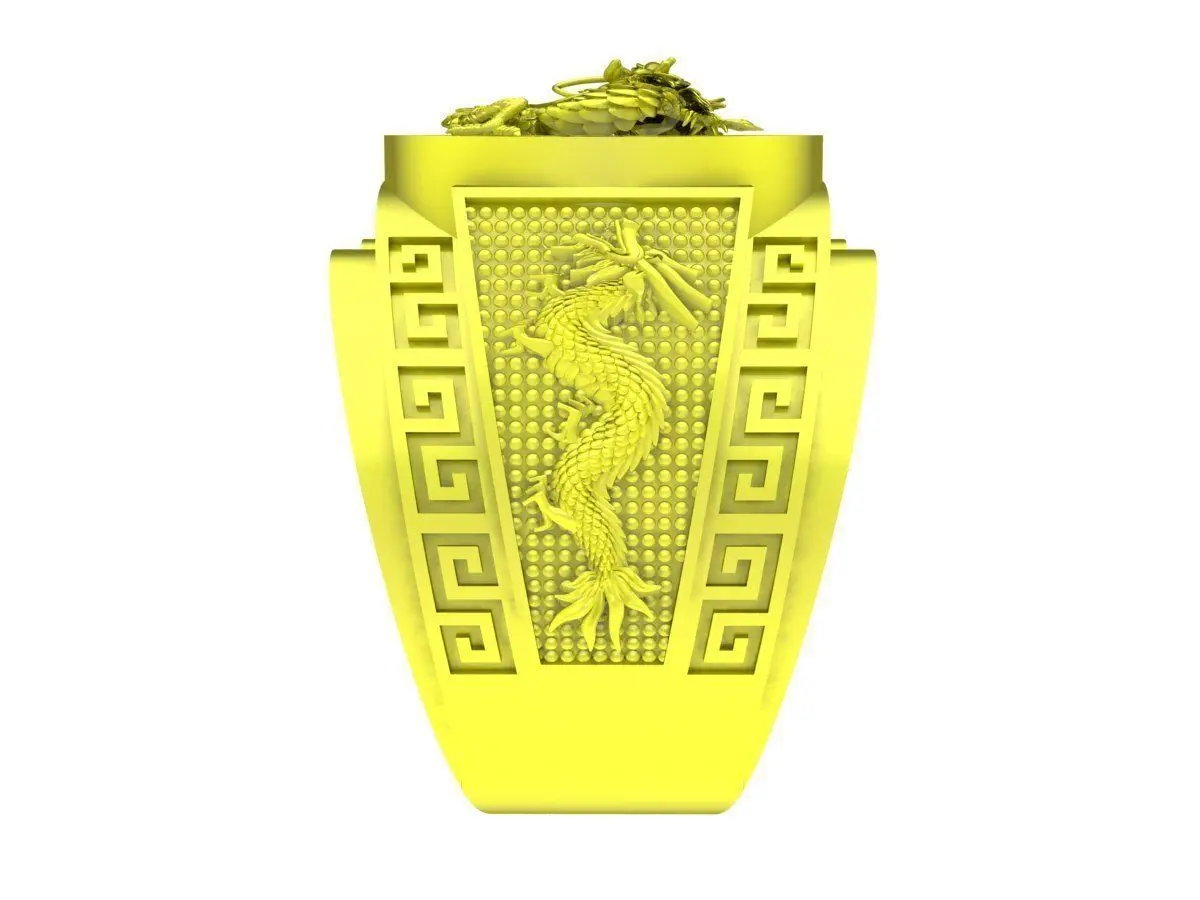 This luxury men’s ring 3D model features a powerful Chinese dragon design, sculpted in high detail with traditional ornamental patterns. The dragon is positioned prominently on the ring’s top, surrounded by classic geometric motifs inspired by ancient Asian art, symbolizing strength, prosperity, protection, and authority.