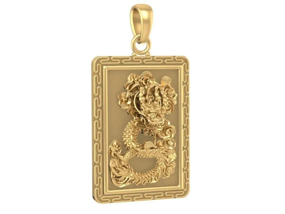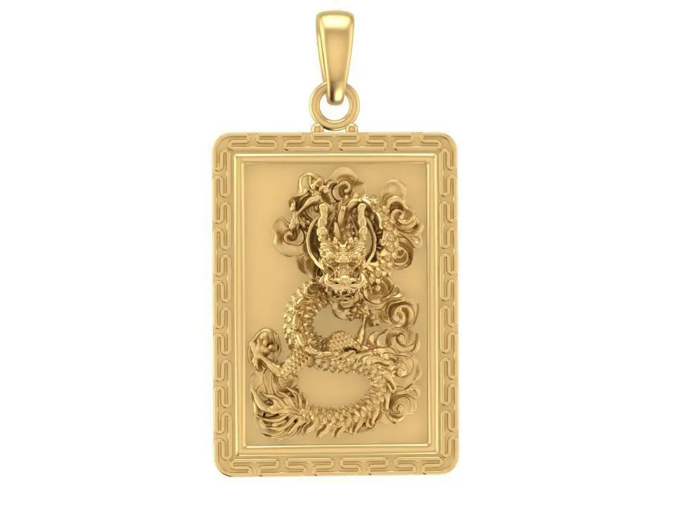 This luxury rectangular dragon pendant features an intricate high-relief sculpture inspired by traditional Chinese symbolism. The detailed carving presents a powerful dragon rising from swirling clouds, symbolizing strength, prosperity, and protection. The border is framed with a clean geometric pattern, adding balance and enhancing the overall premium aesthetic. The model is designed with solid geometry and optimized thickness, making it suitable for gold, silver, brass, or platinum casting.