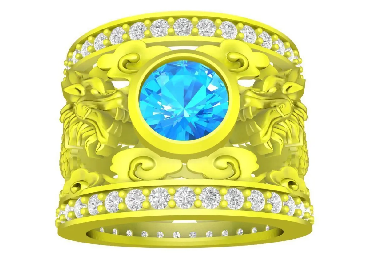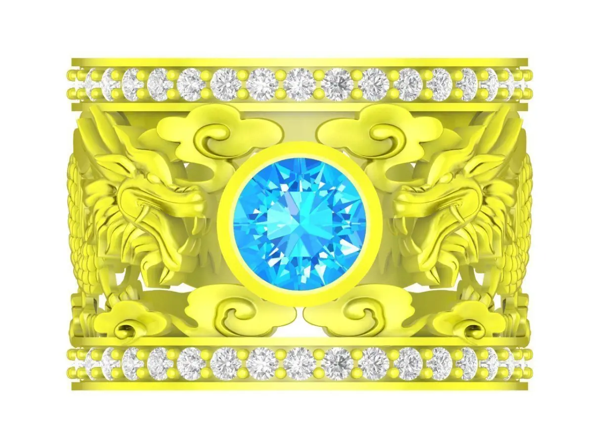 This luxury men’s dragon ring 3D model features a bold Chinese dragon motif combined with a large round center gemstone, symbolizing power, prosperity, protection, and authority. The dragon is sculpted in high relief along the band, creating a strong visual presence inspired by traditional Asian and feng shui jewelry design.