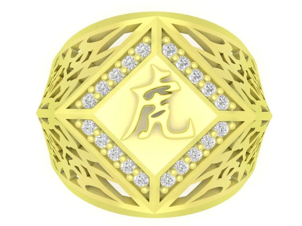 This luxury men’s ring features a bold square top design inspired by traditional Chinese symbolism. The centerpiece showcases the Chinese character “虎” (Tiger), representing strength, courage, authority, and protection. Surrounding the central motif is a geometric diamond-shaped frame accented with pave-set stones, adding brilliance while preserving a strong masculine structure.