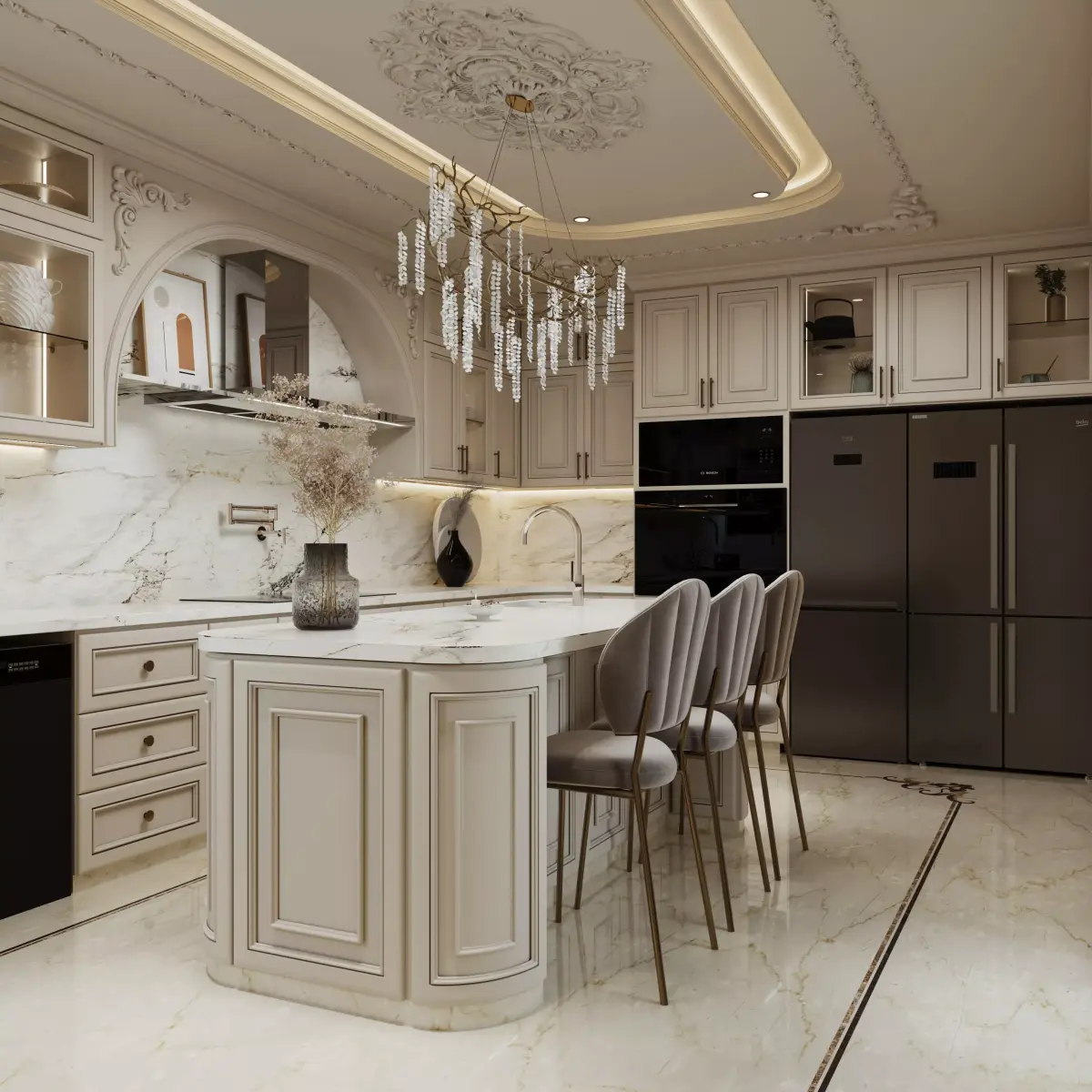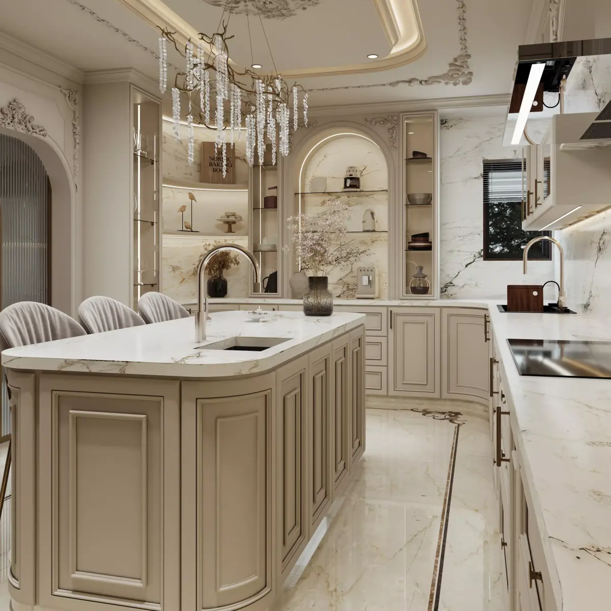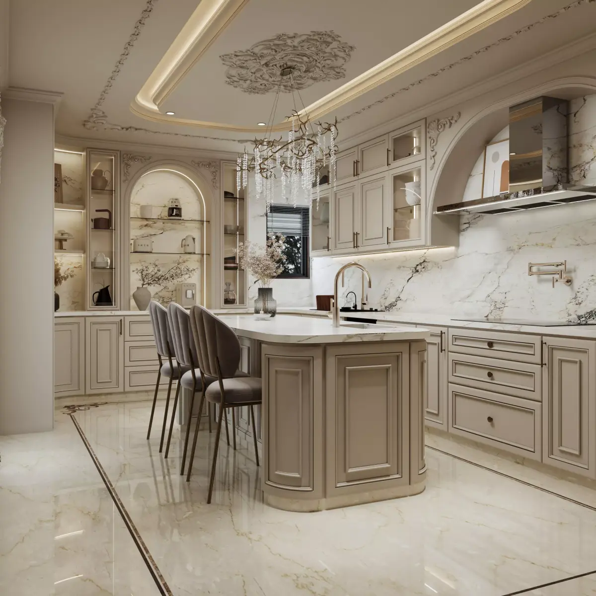 This luxury classic kitchen interior scene is designed for high-end architectural visualization and professional rendering. The environment features a neoclassical style with detailed cabinetry, marble surfaces, decorative ceiling moldings, and an elegant chandelier that creates a warm, luxurious atmosphere.