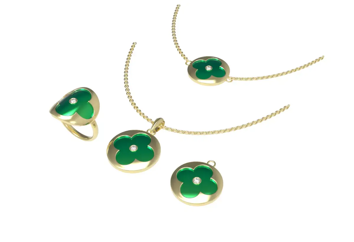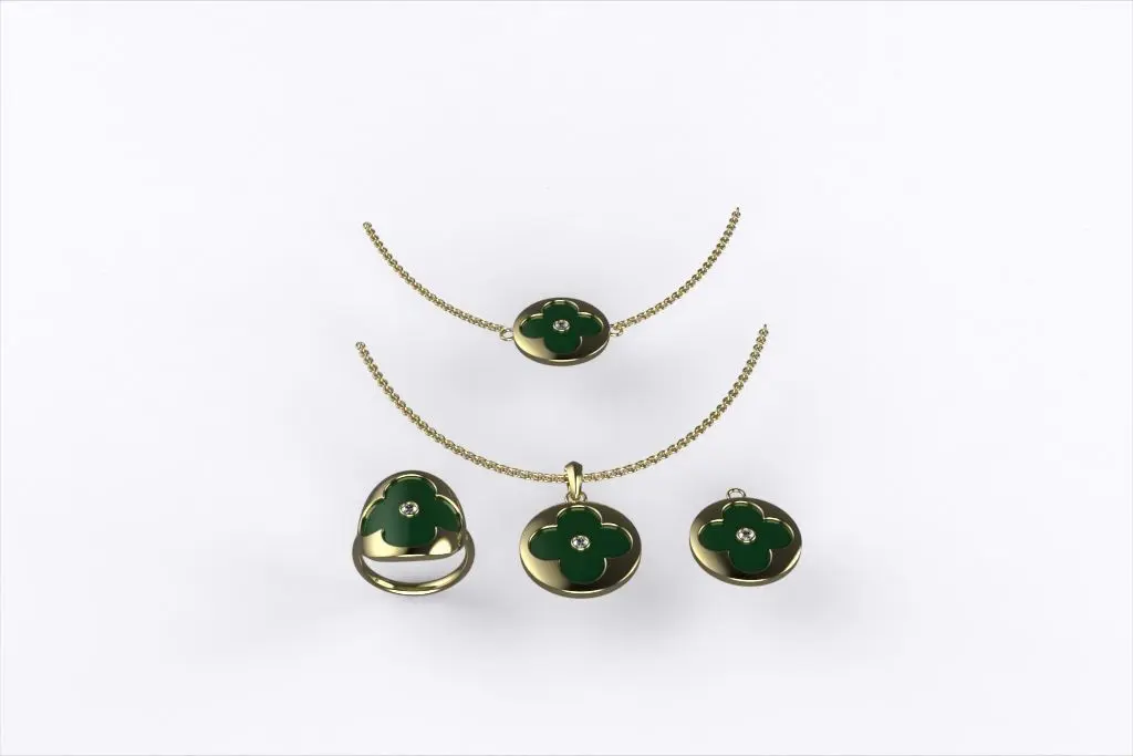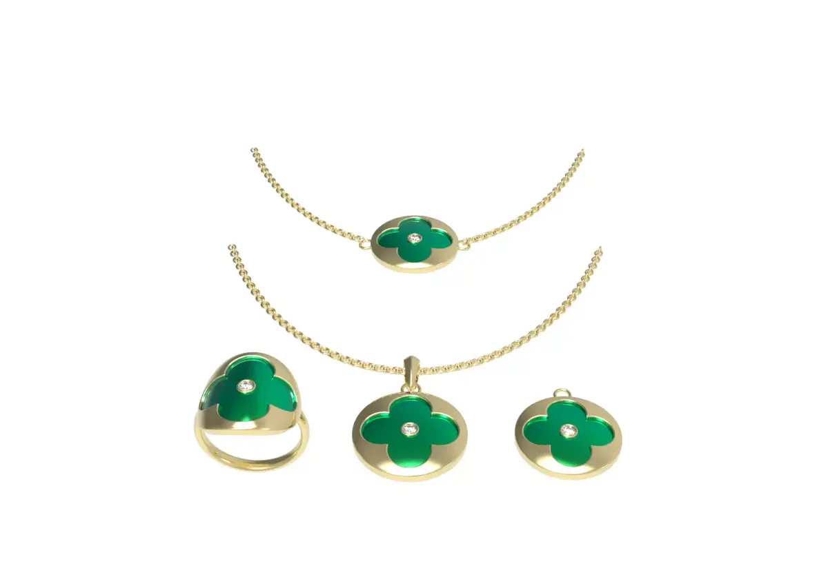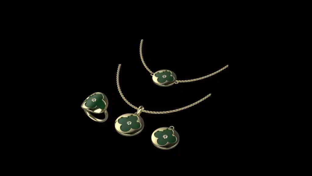 This elegant 3D model features a luxurious jewelry set inspired by the clover motif, a symbol of luck and charm. The collection includes a statement ring, two necklaces, and a pendant, all crafted in high-polish yellow gold with rich green enamel inlays. At the center of each clover sits a sparkling gem detail, adding a touch of refinement.
