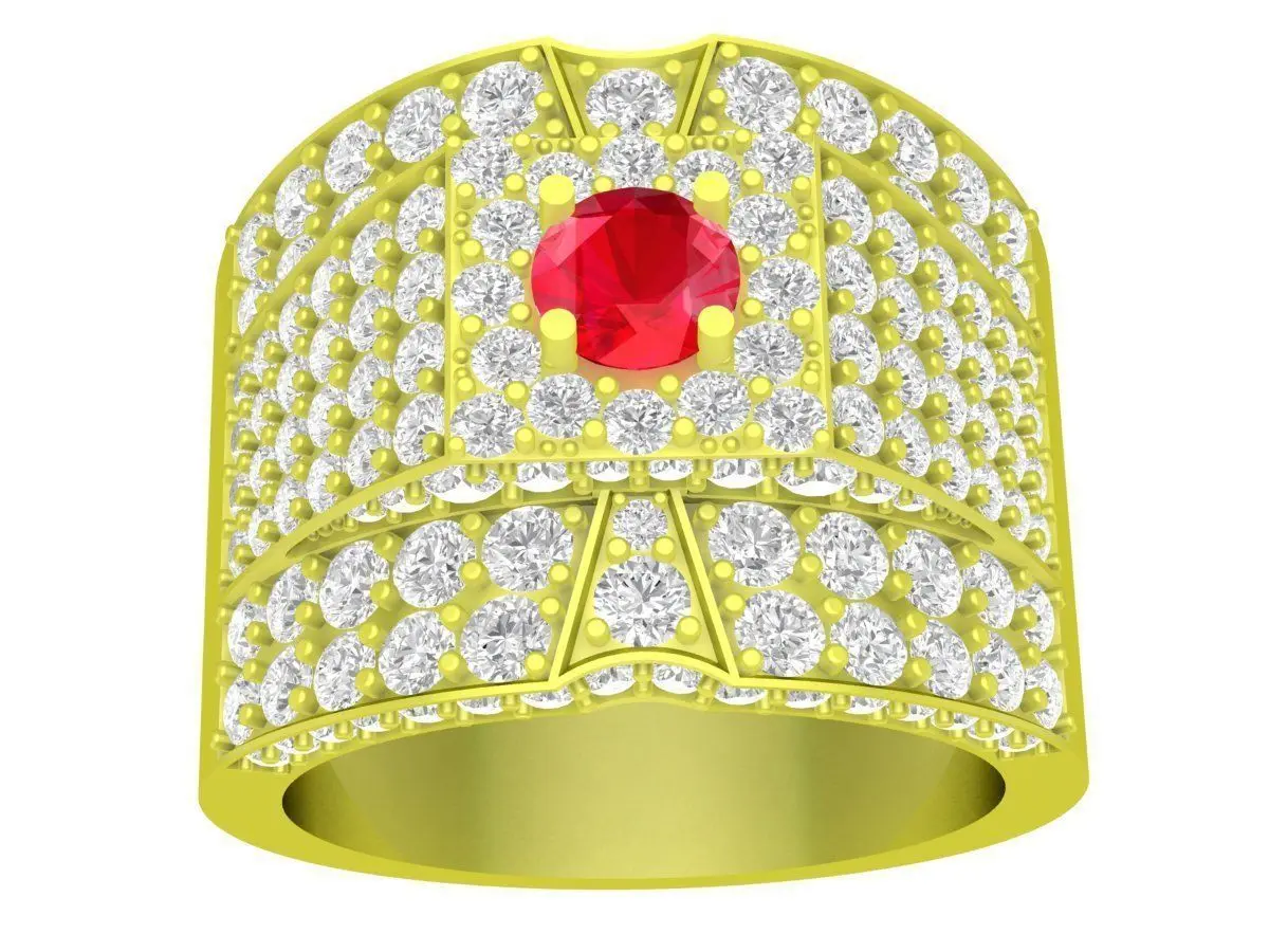This 3D jewelry model presents a bold men’s ring featuring a luxury cluster diamond layout with a prominent center stone and multiple surrounding pavé-set stones. The wide band structure enhances visual impact while maintaining balanced proportions for comfortable wear.