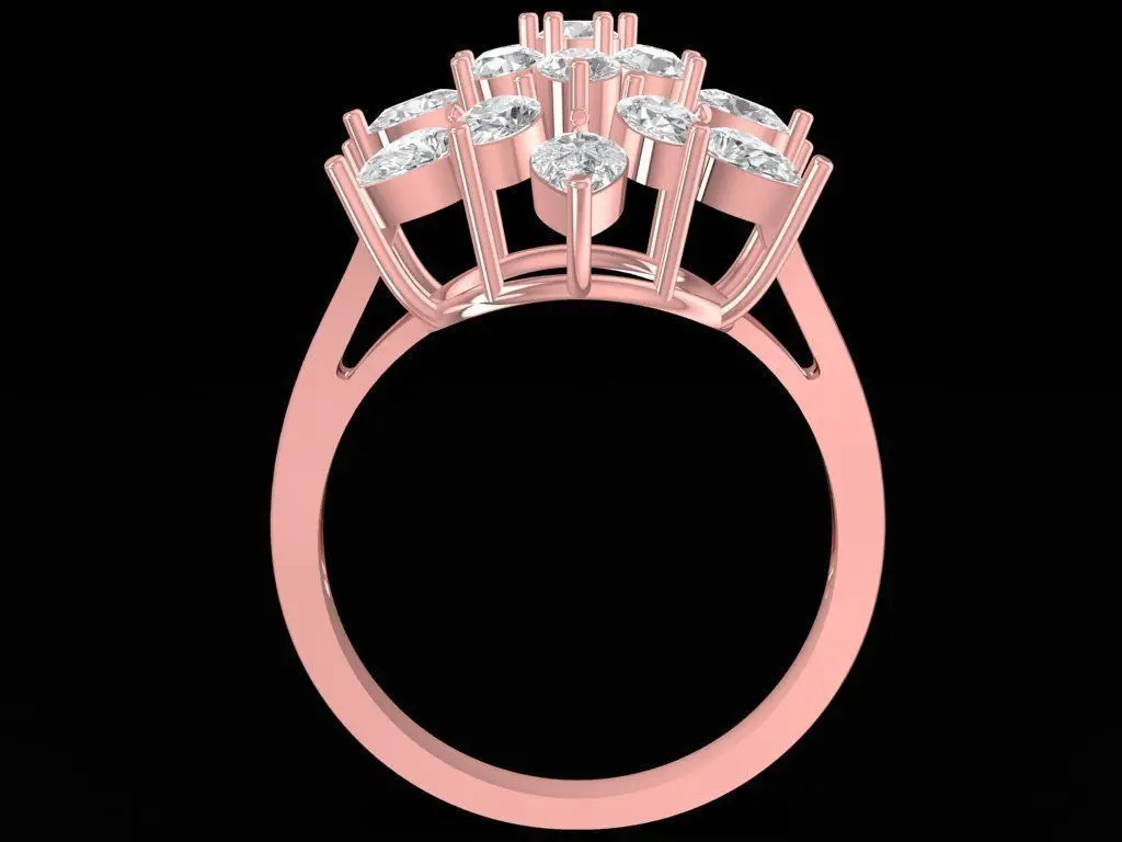This 3D jewelry model features a luxury cluster flower diamond ring for women, designed with a dazzling arrangement of pear and round-cut stones forming a radiant floral motif. The ring’s large bloom shape delivers maximum brilliance from every angle, making it a perfect statement piece for elegant occasions.