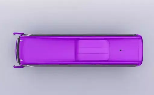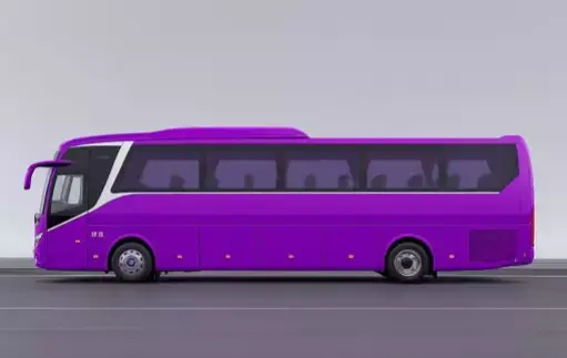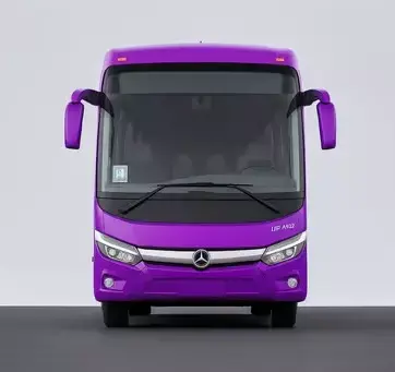 A vibrant, purple luxury coach bus is shown from a front-quarter perspective, appearing to be in motion on a road. The bus has a sleek, modern design with a two-tone color scheme, featuring a bright purple body and a white stripe that runs along the side and over the windows. The front has a contemporary grille and headlights, and a Mercedes-Benz logo is visible on the hubcap, suggesting the vehicle's manufacturer. The image captures the bus in a clean, professional manner, highlighting its elegant and futuristic shape.