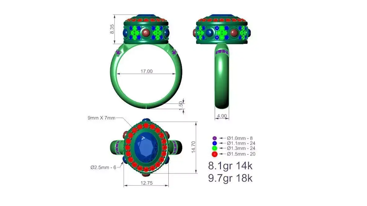 Statement cocktail ring with a large oval center gemstone, accented by a halo of diamonds and additional colored stones around the band.A bold and luxurious design, perfect for special occasions. Optimized for jewelry manufacturing and rendering.