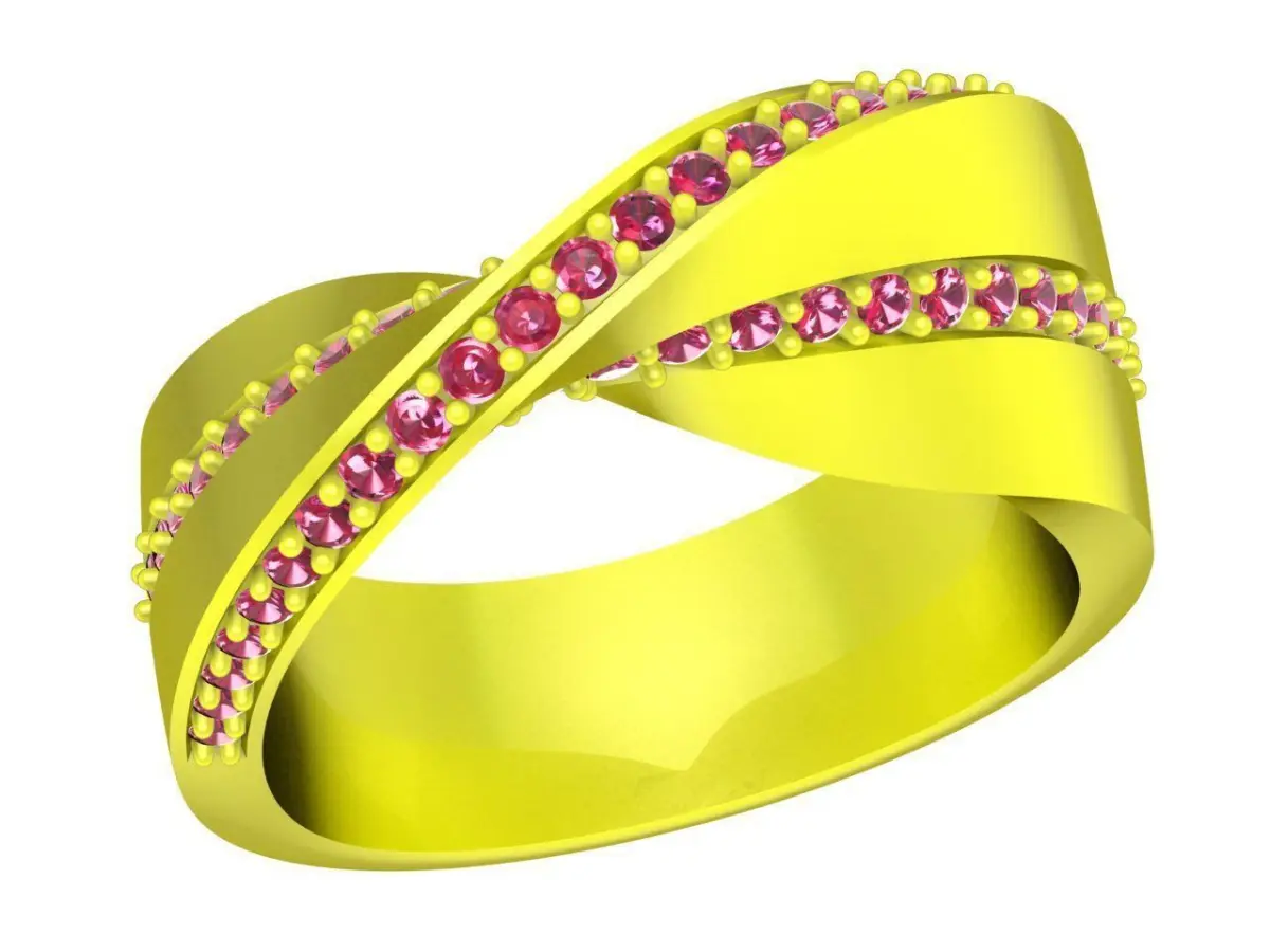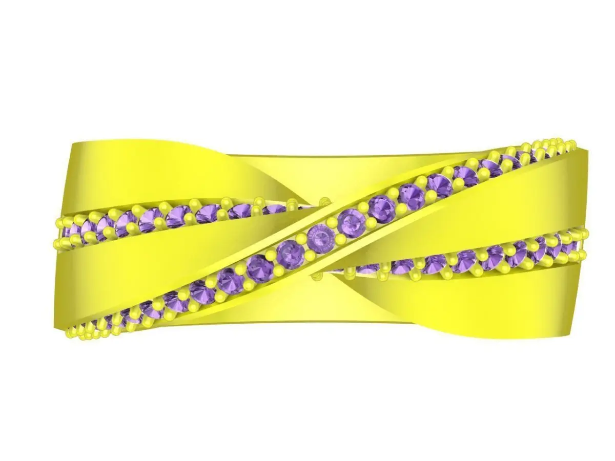 This 3D jewelry model features a luxury criss cross pave gemstone ring designed for women, showcasing a modern and elegant intertwined band structure. The ring is formed by overlapping metal bands, each accented with a continuous row of round gemstones set in a precise pave arrangement.