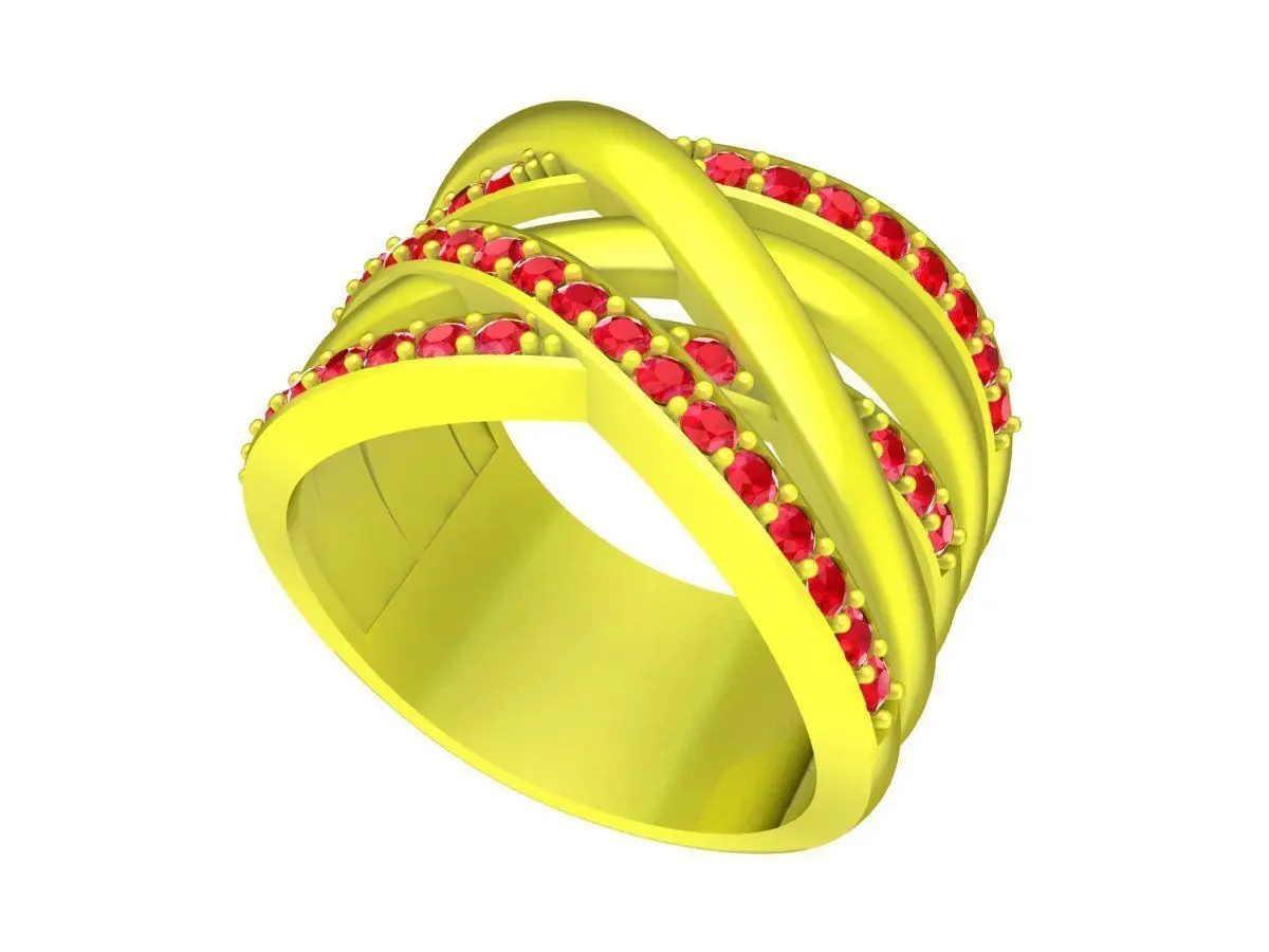The structure is designed with multiple smoothly intersecting bands, carefully balanced to maintain comfort while enhancing visual complexity. Pave stone settings are integrated along selected bands to add sparkle without overwhelming the design, making the ring suitable for both daily wear and statement occasions. The solid shank ensures durability and reliable stone security during casting and finishing.