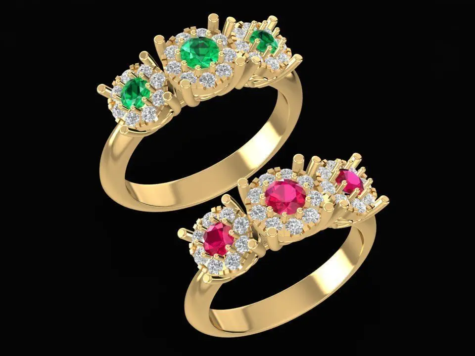 This 3D jewelry model features a luxury crown-style gemstone couple ring design. The rings are beautifully crafted with two center stones in vivid colors (green and red), surrounded by multiple accent diamonds for extra brilliance. The crown motif represents elegance and royalty, making this design suitable for couples, engagements, or as a statement fashion ring.