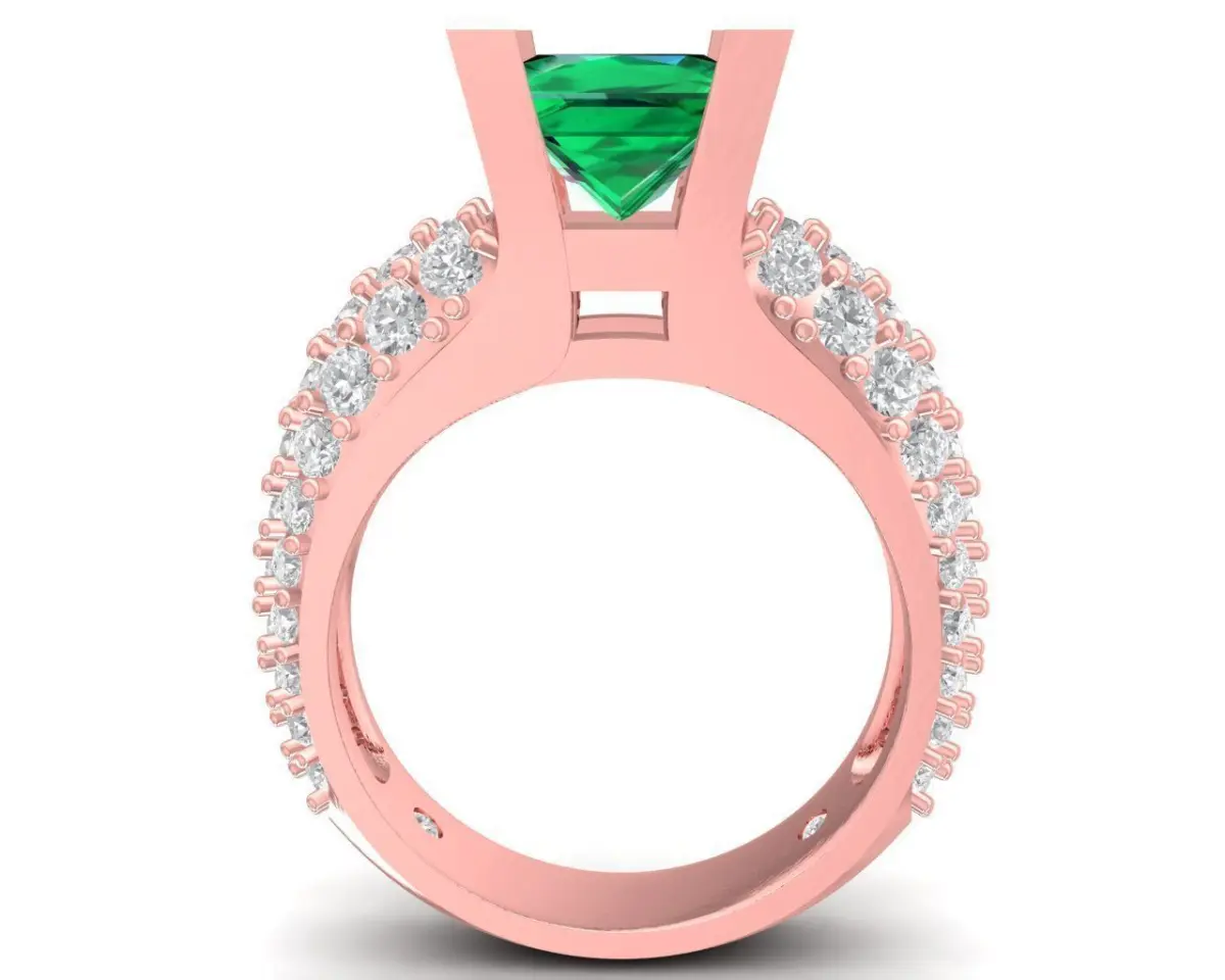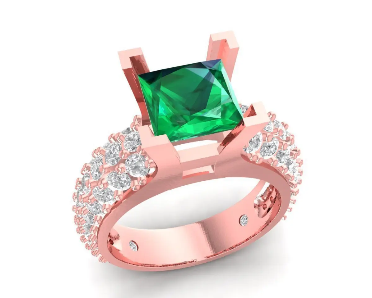 This luxury cushion cut emerald ring is a refined and high-end 3D jewelry model designed for professional gold and silver production. The centerpiece features a stunning cushion-cut emerald set in a secure four-prong basket, offering exceptional brilliance and strong visual impact. Surrounding the center stone is a full pavé diamond band, with round-cut diamonds meticulously arranged along the shank to create continuous sparkle from every viewing angle.