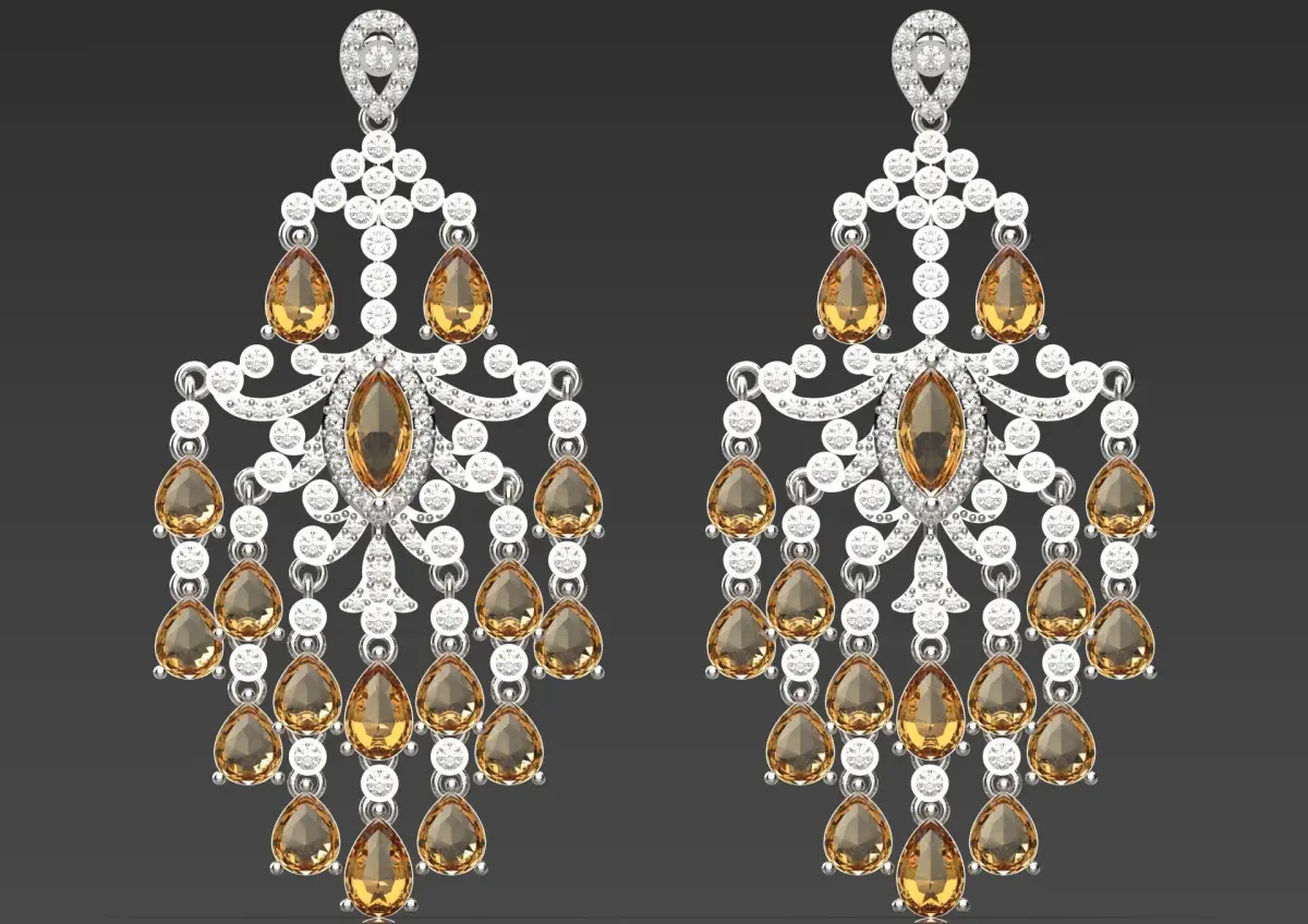 Each earring features an intricate and intricate design, characterized by a delicate lattice pattern. The structure is adorned with a variety of gemstones, including vibrant yellow sapphires and clear diamond stones. The prominent yellow sapphire stones are cut into teardrop and marquise shapes and cascade together, giving the earrings a graceful and flowing look.