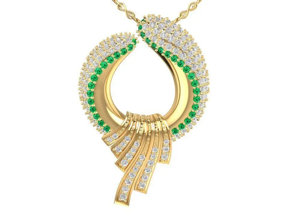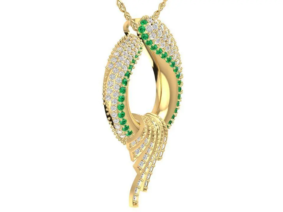 This luxury diamond emerald pendant necklace features a unique twisted loop design with sparkling stones. Perfect for 3D modeling, jewelry production, and rendering in gold, platinum, or silver. Elegant style for women, suitable for special occasions, daily fashion, engagements, or anniversary gifts. Dimensions and gemstone details included.