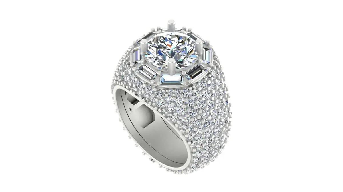 This image presents a highly detailed 3D CAD (Computer-Aided Design) model of a luxurious diamond-encrusted gold cocktail ring, intended for fine jewelry production. The design features a large central faceted gemstone, securely held by prong settings, and a pavé-style arrangement of numerous smaller diamonds surrounding the main stone and covering the entire body of the ring.