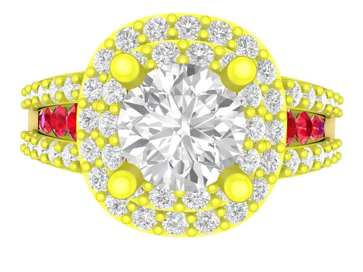 This luxury ring 3D model features a sophisticated halo design centered around a large round-cut diamond, enhanced by a double halo and pavé-set accents along the shank. The design combines brilliance, elegance, and strong visual presence, making it ideal for engagement rings and high-end women’s jewelry collections.