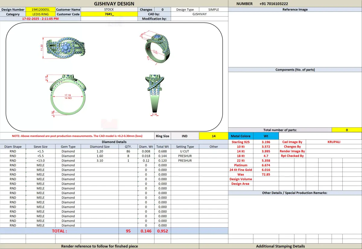 The editable CAD file allows easy customization such as ring size changes, metal variation, and stone size adjustments according to production requirements.