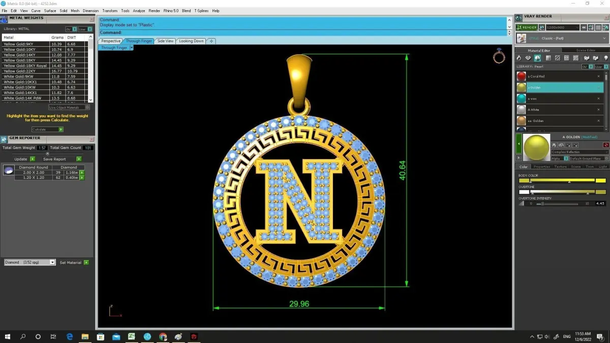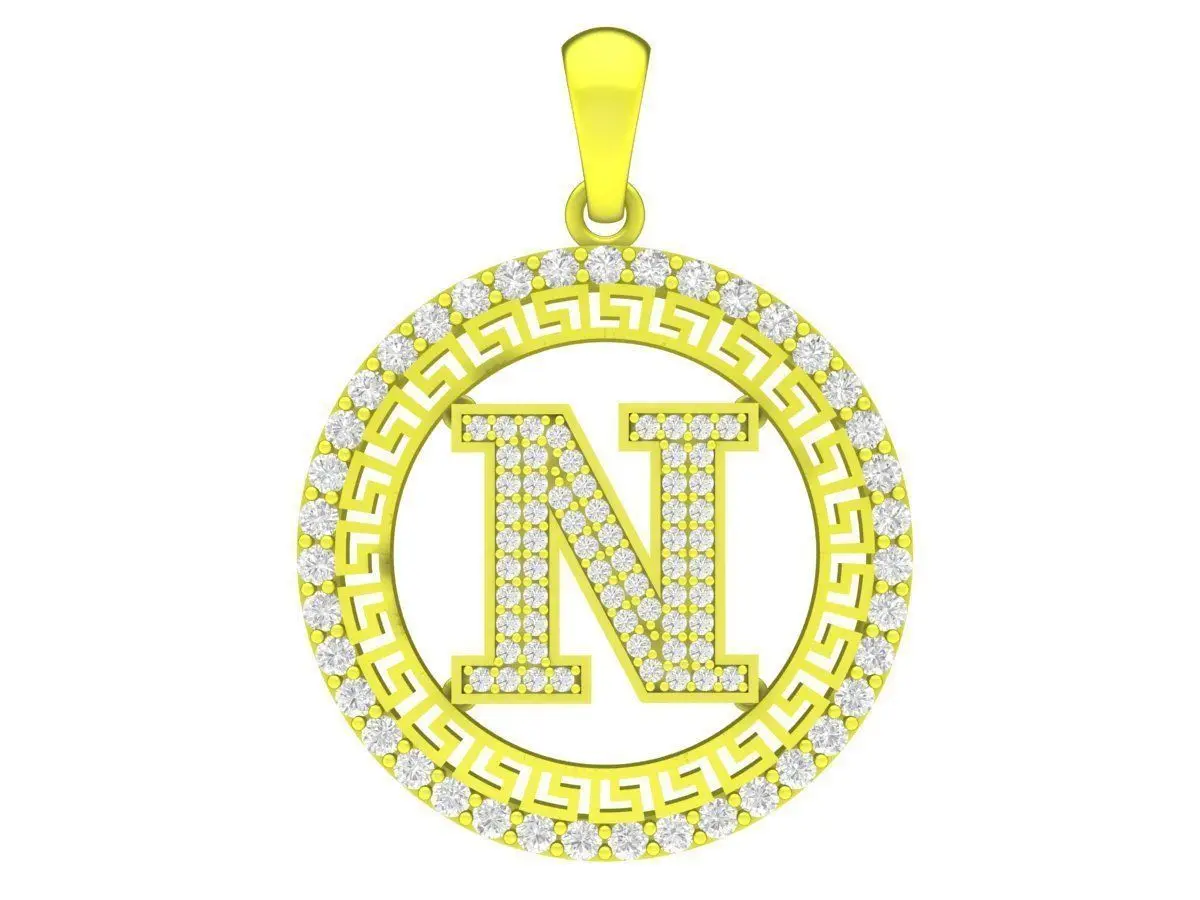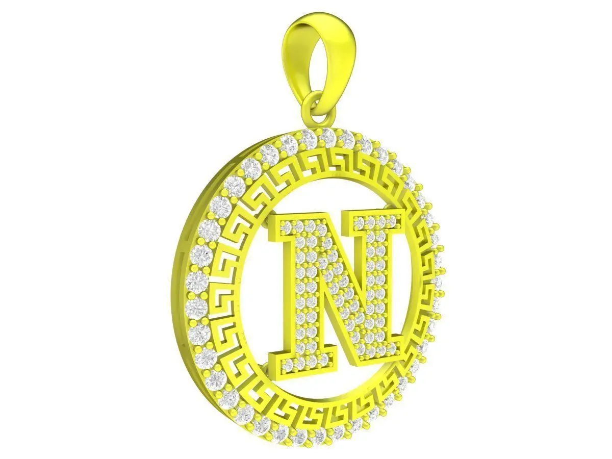This luxury diamond initial N pendant 3D model features a bold capital letter N set inside a round medallion frame with a classic Greek key border design.