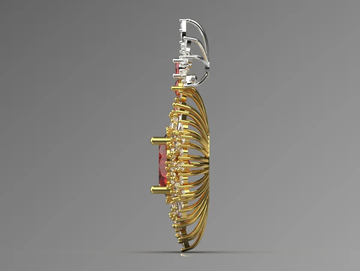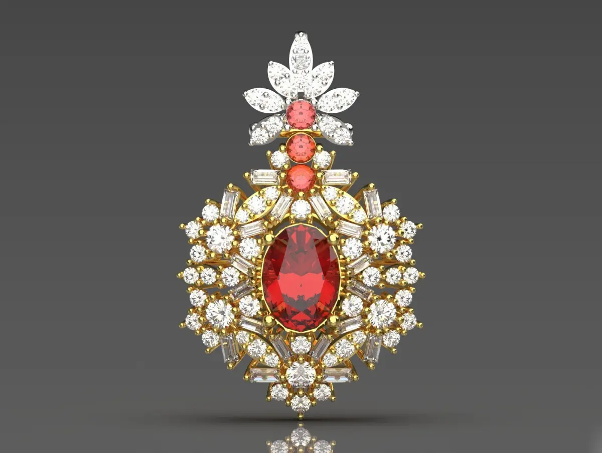 This is a luxurious and ornate ring featuring a prominent marquise-cut red gemstone at its center, surrounded by an intricate arrangement of smaller clear gemstones. The ring appears to be crafted with a yellow gold setting, which enhances the vibrant red of the central stone. The design includes multiple smaller round, baguette, and marquise-shaped diamonds arranged in a decorative pattern that radiates outward, giving the ring a sparkling, floral, or sunburst-like appearance. Additionally, a small cluster of white diamonds sits atop the ring, adding to its opulence and intricate detailing. This piece exudes elegance, sophistication, and a bold sense of style.