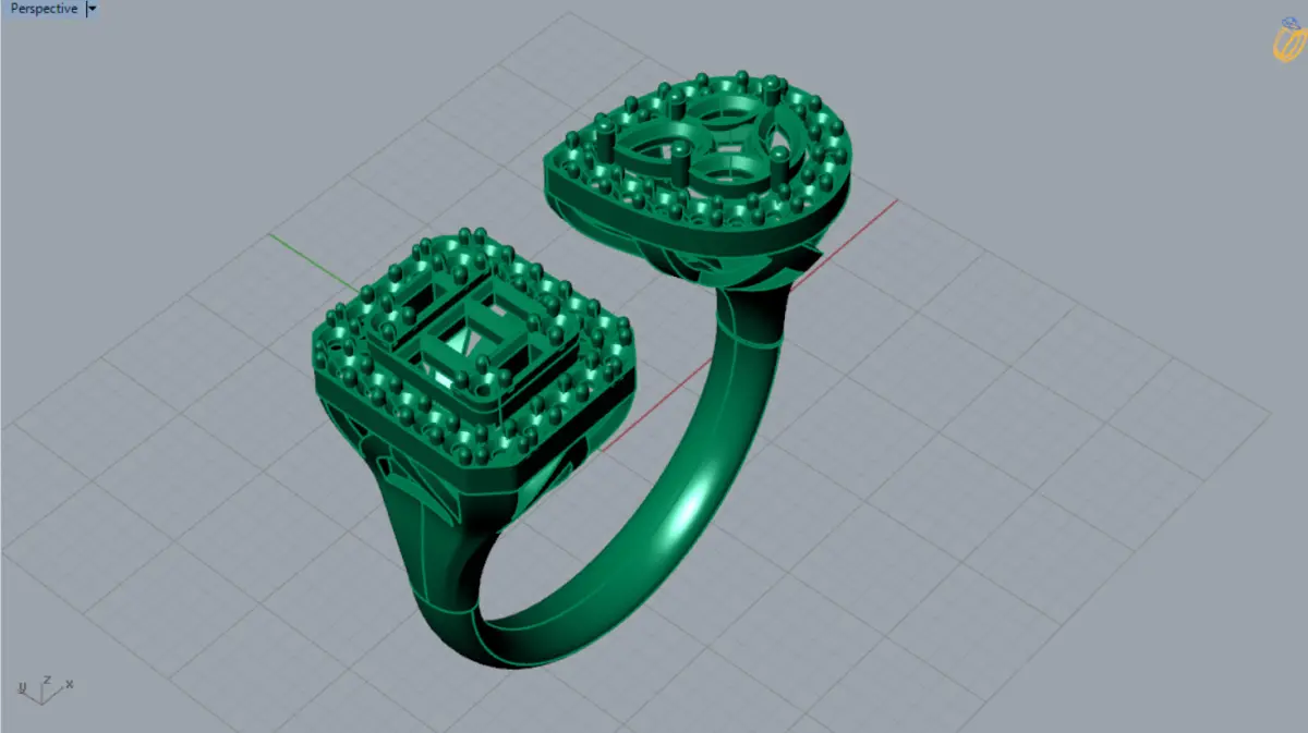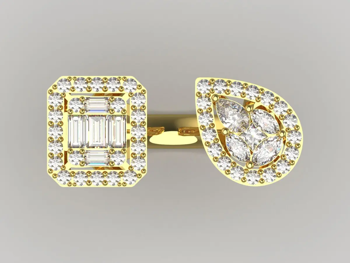This image features a luxurious gold ring with a unique double band design. The top of the ring showcases a square-shaped setting encrusted with numerous sparkling diamonds, arranged in a symmetrical pattern. The ring's design is ornate and elegant, emphasizing the brilliance of the diamonds and the richness of the gold. The overall look exudes opulence and craftsmanship.
