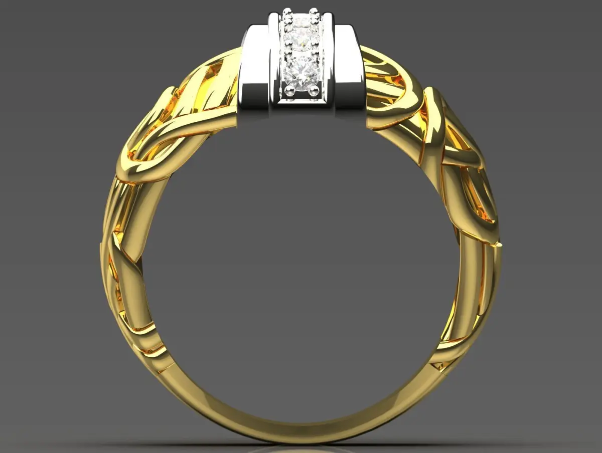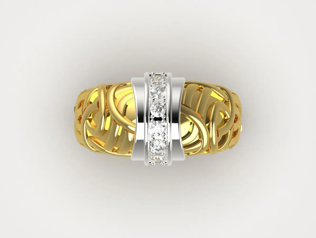 This ring features a bold and intricate design, crafted from a combination of yellow gold and white gold. The arm is predominantly yellow gold with intricate woven details that give it a unique and artistic look. At the top, a modern, layered bezel is set with a shiny white gold element and a sparkling diamond band. The contrast between the shiny yellow gold and the white gold with diamonds creates a striking and luxurious look. Overall, this is a standout piece that combines elegance with contemporary design.