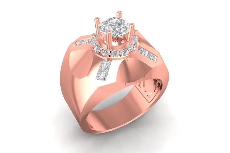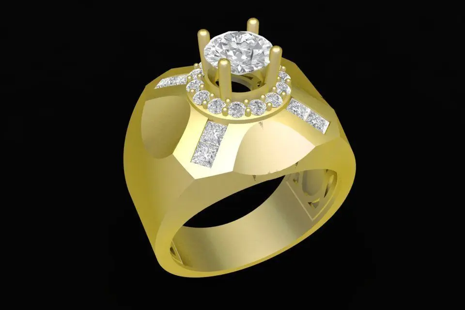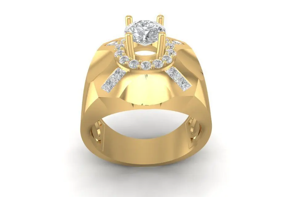 This 3D model presents a luxury men's ring featuring a bold and elegant design with a brilliant round-cut center diamond. The wide band is polished to perfection and accented with fine geometric detailing on the shoulders, symbolizing strength and success. The model is optimized for high-end jewelry manufacturing and realistic rendering.