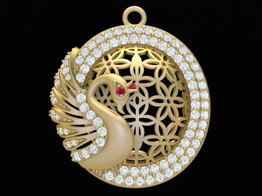 This luxury diamond pendant features an elegant swan motif surrounded by a circular frame with a floral lattice design. The swan is adorned with carefully placed diamonds along its wing, enhancing its graceful form and brilliance. The contrast between polished surfaces and pavé-set stones makes this pendant a statement piece suitable for fine jewelry collections.
