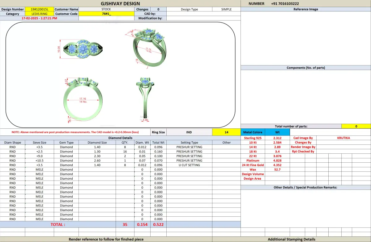 The editable CAD file allows easy customization such as ring size adjustment, metal variation, and stone size modification according to production requirements.