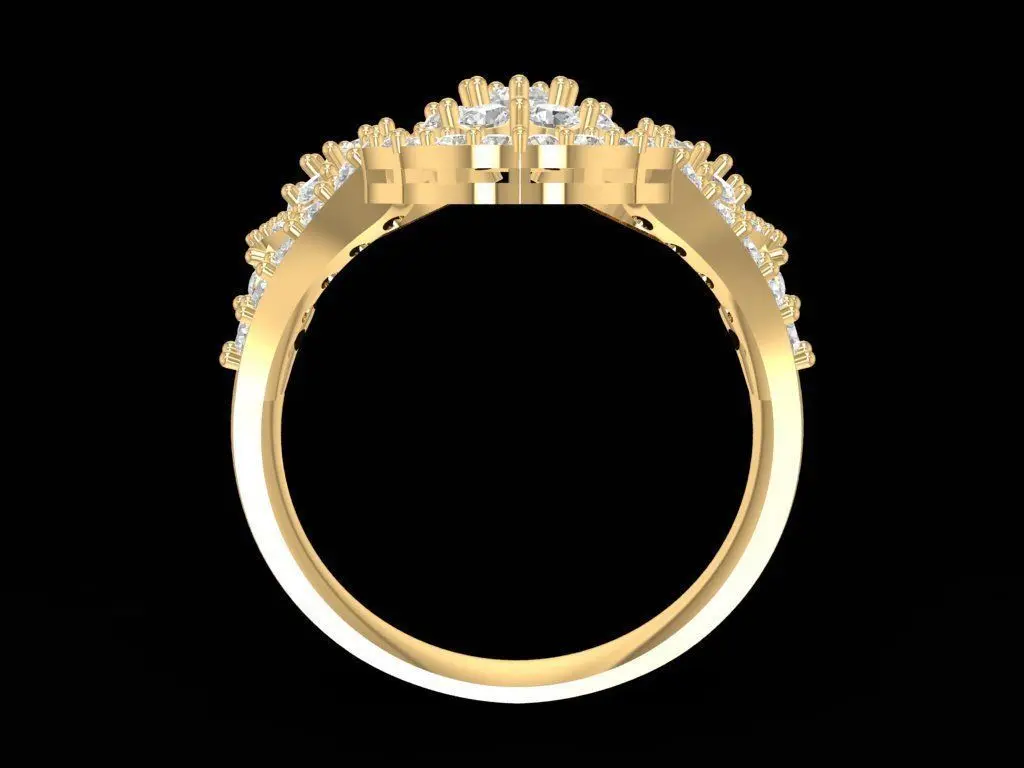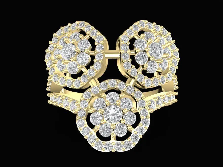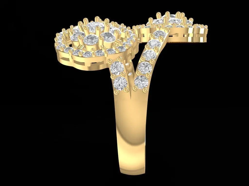 This 3D model showcases a luxury double flower twist diamond ring for women, featuring two blooming floral motifs beautifully connected by a gentle twist band. Each flower is meticulously set with brilliant-cut stones to enhance sparkle and volume, creating a radiant and elegant appearance. The design combines romantic charm with refined craftsmanship, suitable for formal occasions or as a statement jewelry piece.