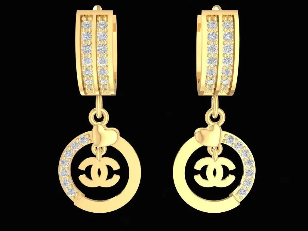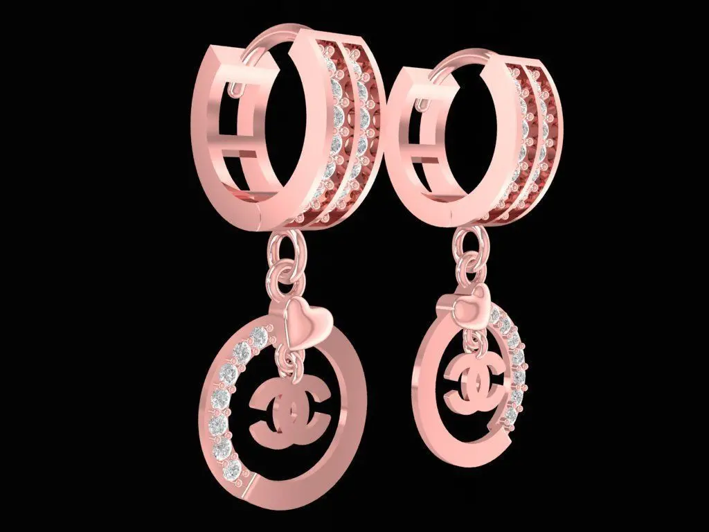 This 3D jewelry model showcases a pair of luxury double hoop pendant earrings for women. The earrings feature a sleek circular hoop design with small round-cut stones along the outer band, attached to a second dangling circle that adds movement and brilliance. The geometric structure combines elegance and modern aesthetics, suitable for daily wear or high-end fashion jewelry collections.