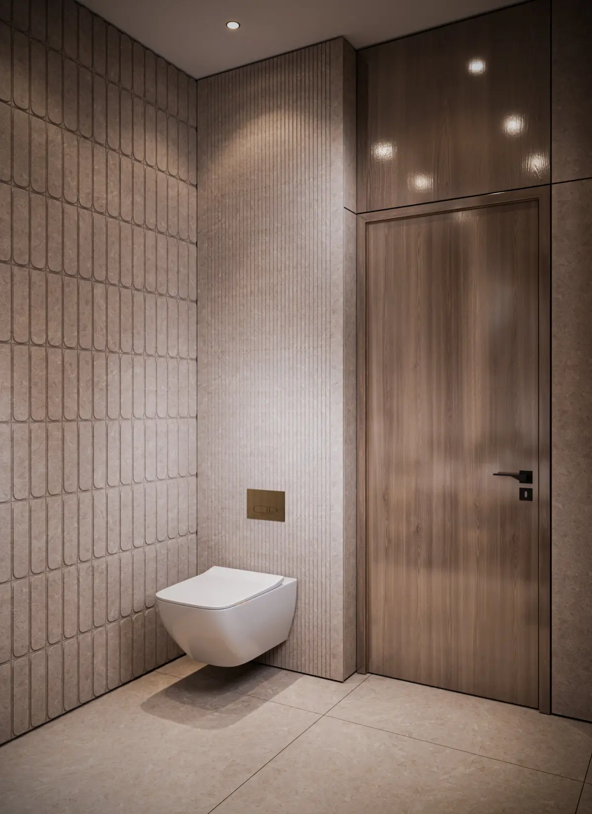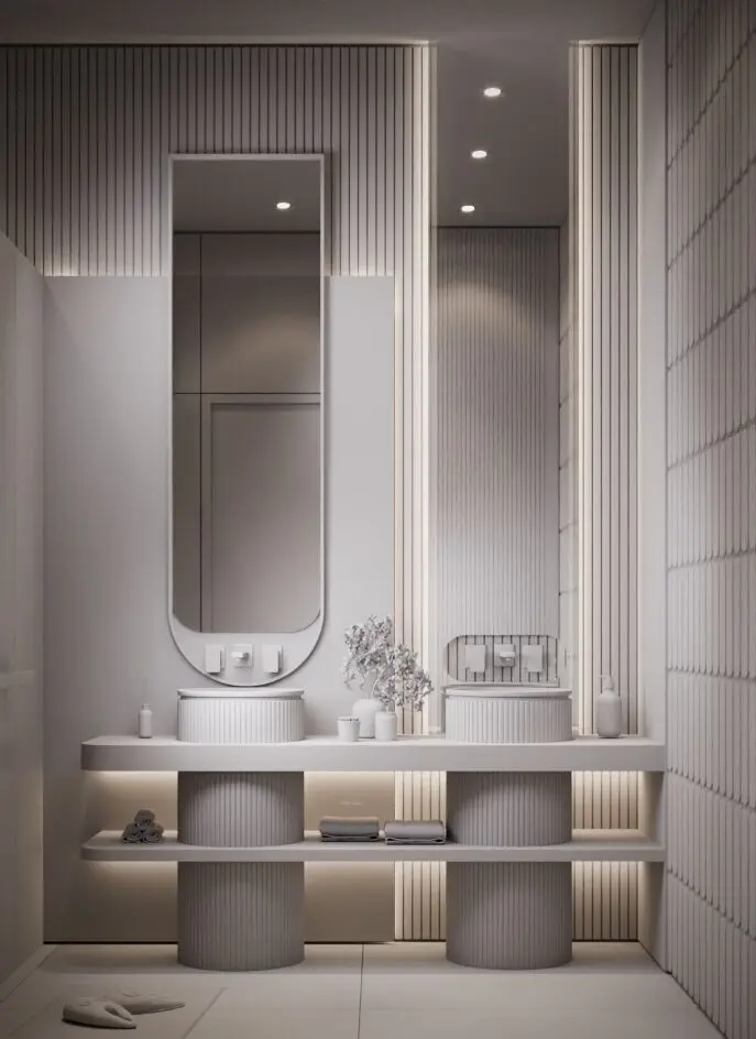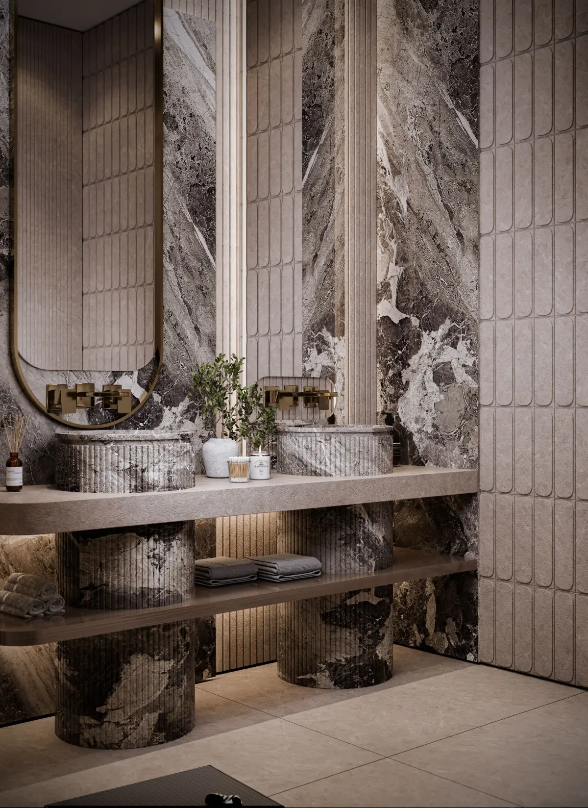 This elegant bathroom scene showcases a meticulously crafted double vanity design, blending natural stone textures with warm, vertical wood cladding to create a serene and luxurious ambiance. Ideal for high-end residential or hospitality visualizations, the scene emphasizes refined materiality and balanced composition.