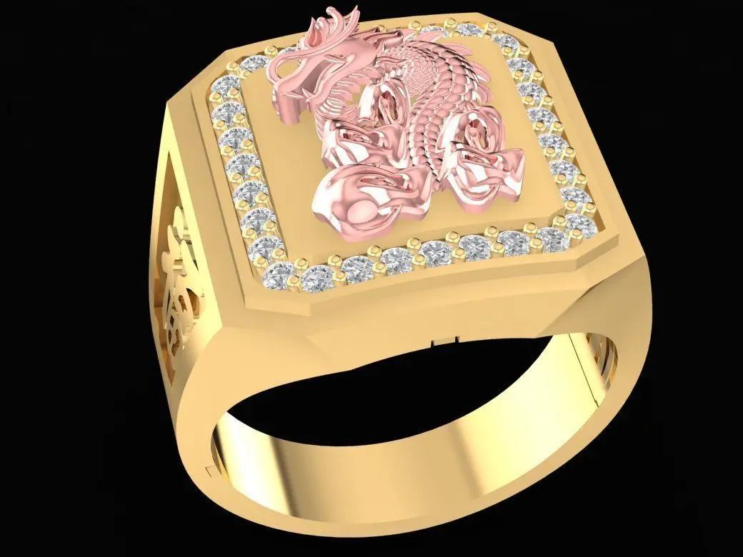 This 3D model showcases a luxury dragon and phoenix diamond ring for men, symbolizing power, balance, and prosperity. The ring features an intricate dual-tone design with the dragon and phoenix sculpted in high detail, representing strength and harmony. The border is elegantly set with round diamonds that highlight the central relief, giving the ring a majestic and royal appearance.