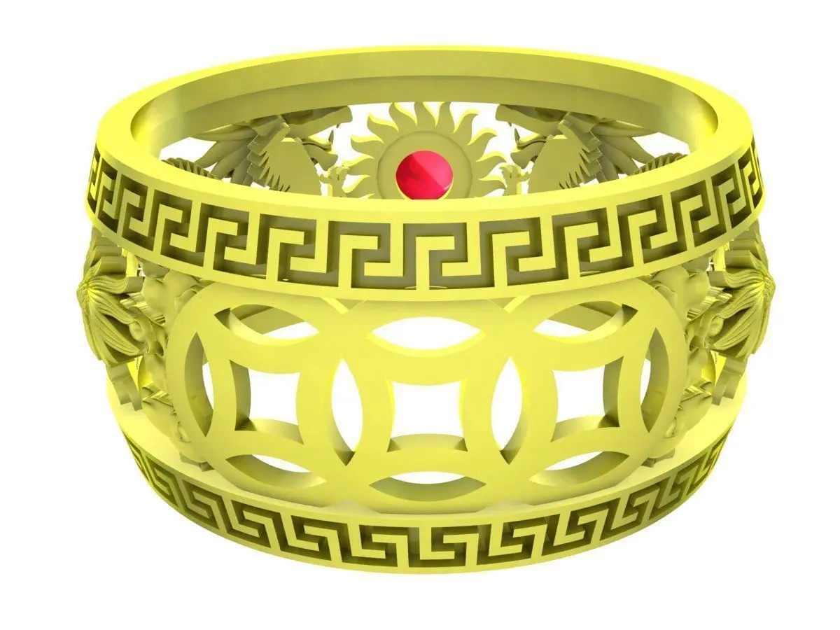 This luxury dragon Greek key ring 3D model combines powerful Asian symbolism with classic geometric ornamentation. The design features sculpted dragons wrapping around the band, representing strength, protection, and prosperity. A round gemstone is set at the center as a focal point, framed by detailed relief elements that enhance depth and visual impact. The Greek key pattern runs continuously along the upper and lower edges, adding a timeless architectural aesthetic and cultural balance to the design.