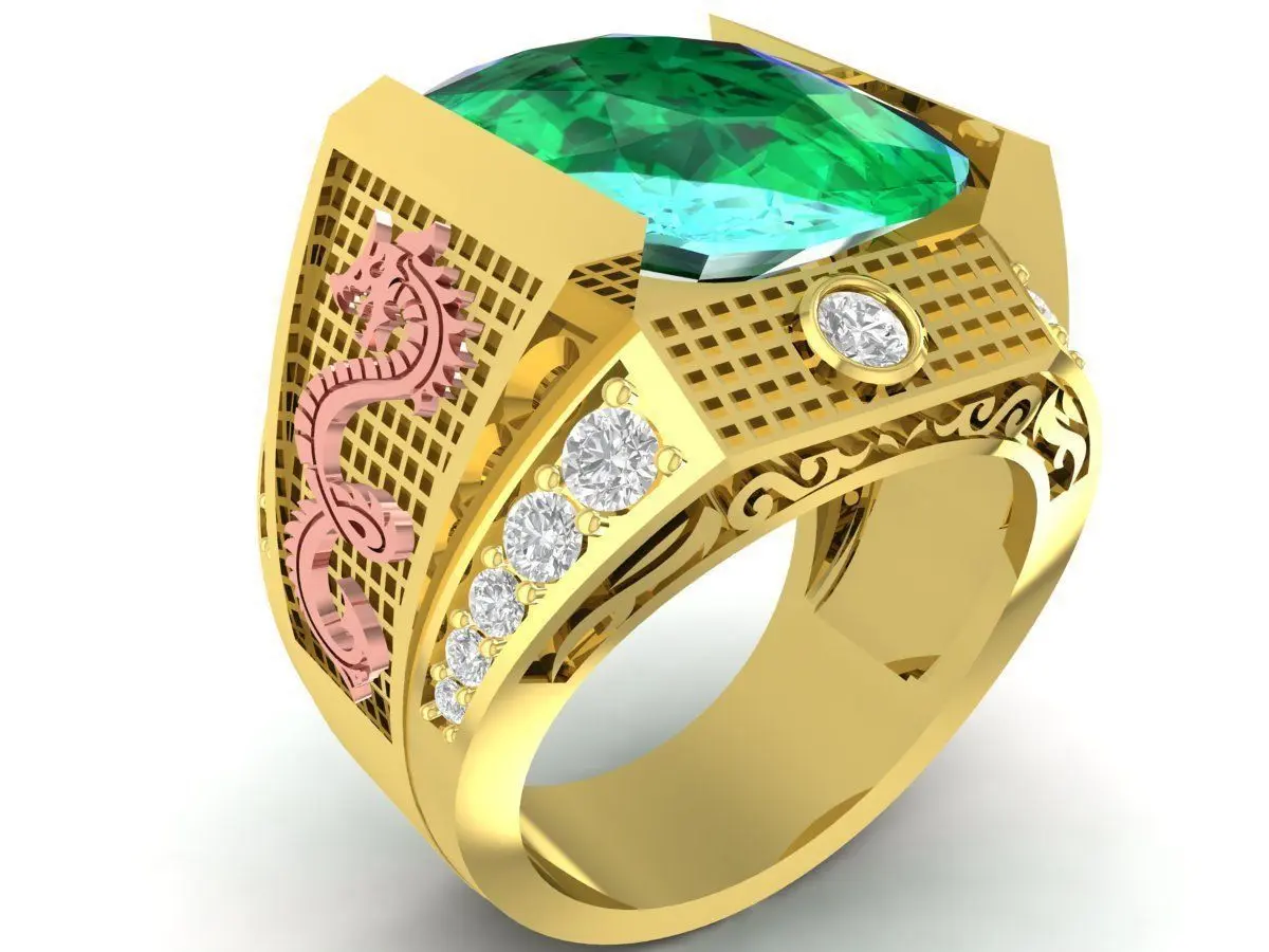 This Luxury Dragon Signet Ring with Large Gemstone CAD model showcases a bold masculine design featuring an oversized octagonal center stone and detailed dragon motifs on both sides. The ring combines strong geometric lines with ornamental lattice patterns, producing a premium look suitable for high-end men’s jewelry collections. The dragon engravings and pavé-set round stones enhance the visual richness, while the wide shank provides both comfort and durability.