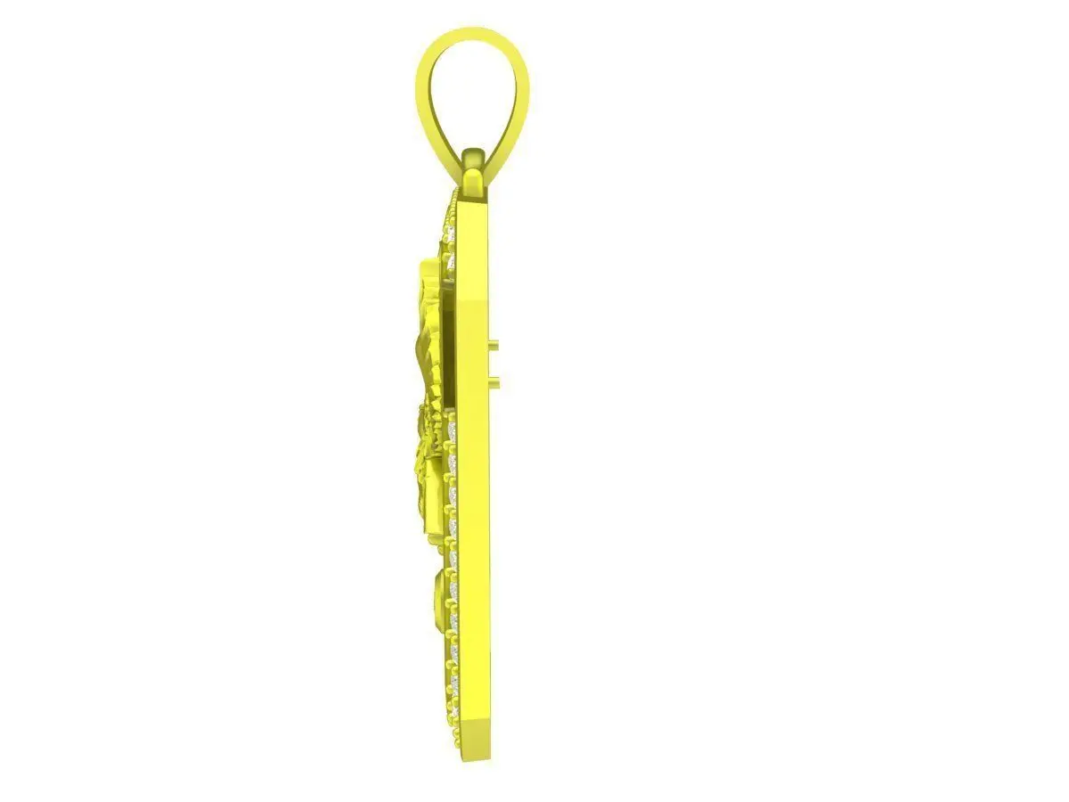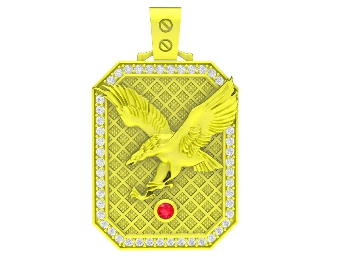 This luxury men’s dog tag pendant features a powerful eagle motif sculpted in high relief, symbolizing strength, freedom, and authority. The eagle spreads its wings across a textured background, creating a bold and dynamic visual impact. A pavé stone border frames the rectangular tag shape, adding refined brilliance while maintaining a masculine aesthetic.