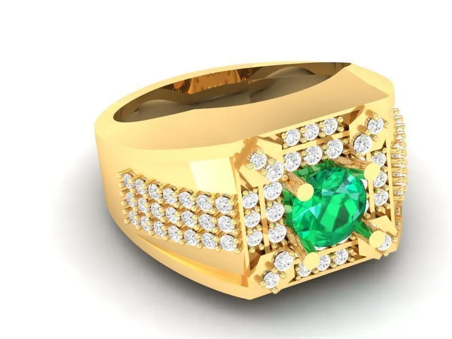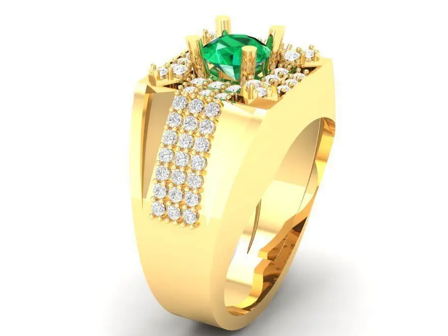 This luxury men’s gold ring features a vivid emerald gemstone at its center, enhanced by a geometric diamond arrangement that radiates strength and prestige. The design combines bold masculine proportions with refined detailing, resulting in a piece that conveys confidence and sophistication. The emerald’s rich green hue contrasts beautifully against the polished yellow gold surface, creating a timeless and powerful statement.