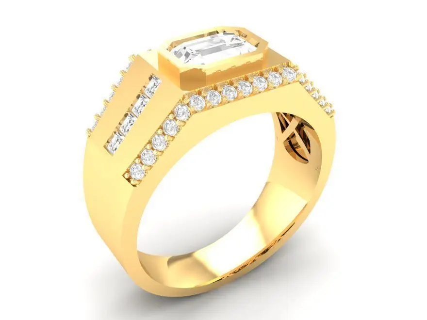 This 3D jewelry model showcases a luxury men’s ring featuring an emerald-cut diamond at the center, enhanced by a full pavé halo and elegant side stones. The design combines masculine geometry with refined elegance, creating a timeless statement piece for modern gentlemen. The broad band and sharp edges emphasize strength, while the detailed micro-setting ensures maximum sparkle and sophistication.