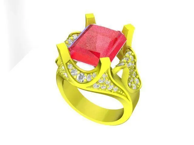 This 3D jewelry model features a luxury women’s ring designed with a bold emerald cut center stone and elegant diamond accents along the shoulders. The structure highlights a strong yet refined setting, balancing gemstone prominence with smooth flowing metal lines.