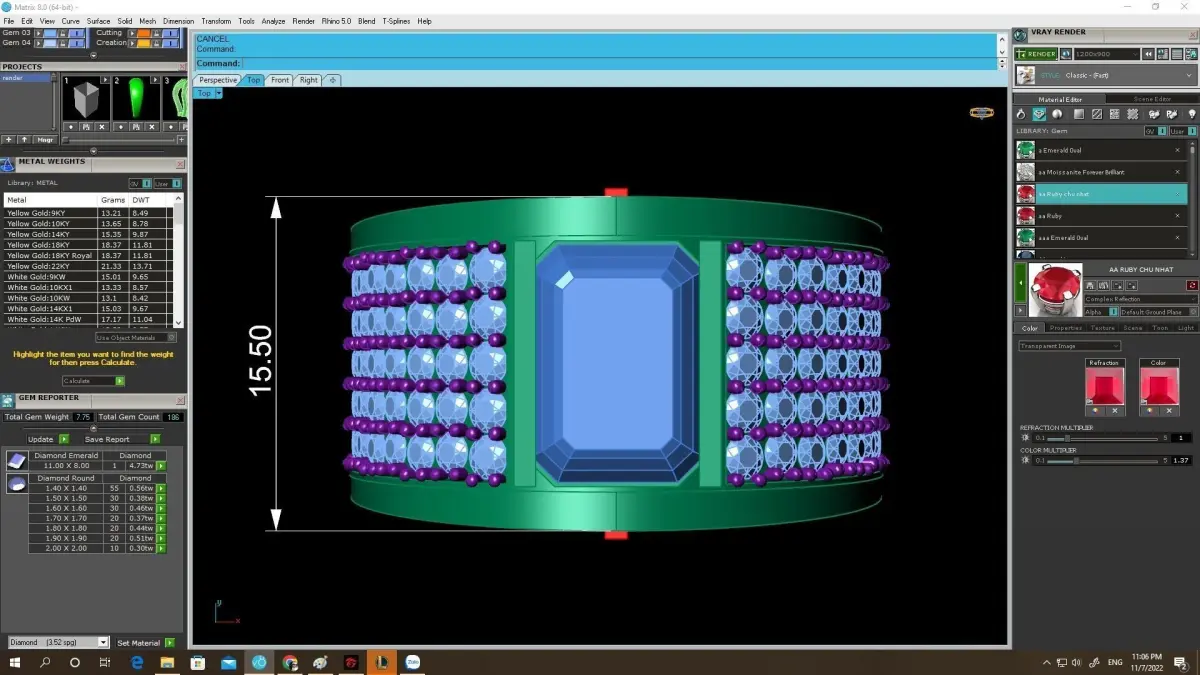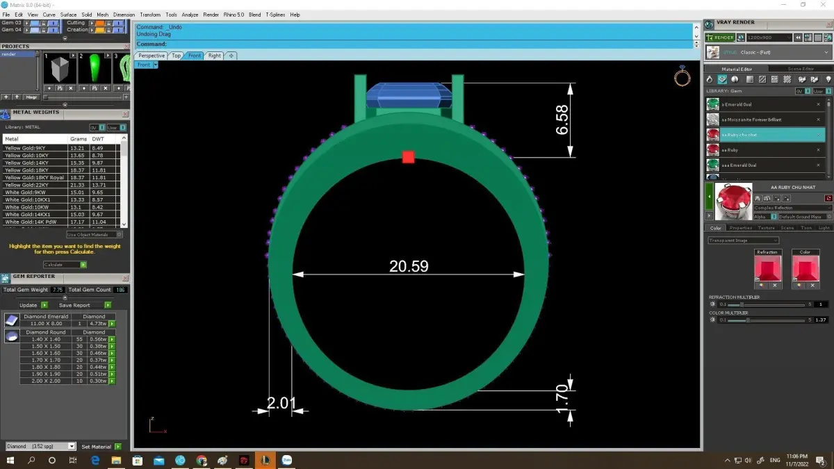 All dimensions, stone sizes, stone quantities, and estimated metal weight are clearly displayed in the preview images. The model is professionally built with clean geometry and optimized thickness, ensuring excellent performance for CNC machining, resin printing, and lost wax casting.