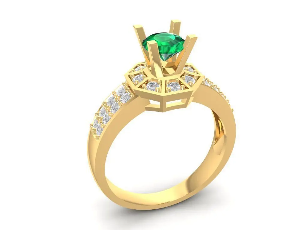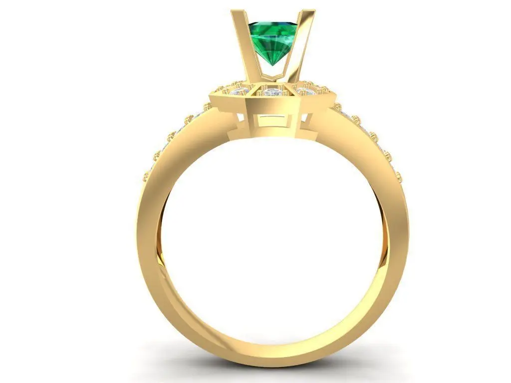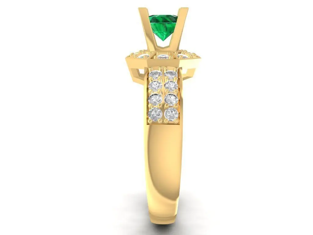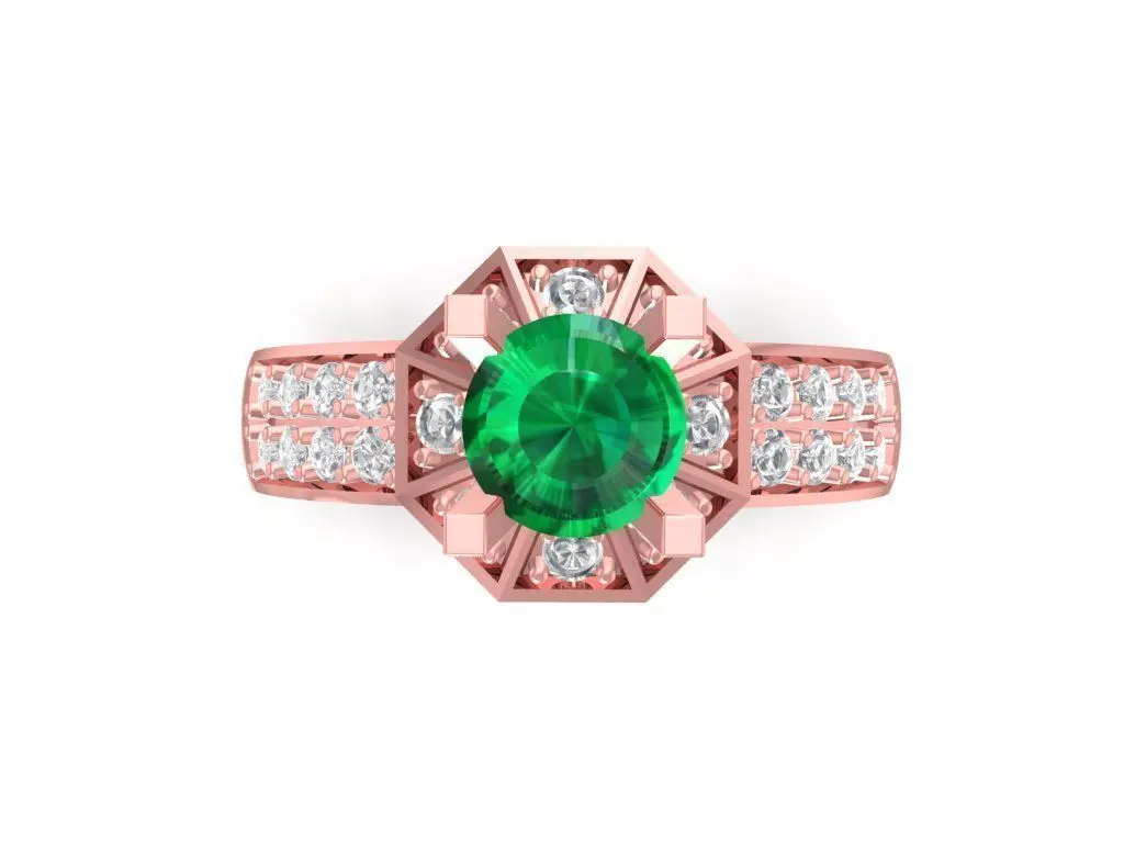 This 3D model showcases a luxury women’s ring featuring a brilliant round emerald center stone accented with sparkling side diamonds. The shoulders are adorned with a combination of square and round cut stones, enhancing brilliance and creating an elegant design.