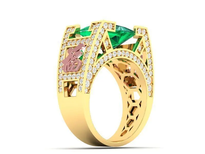This luxury emerald diamond ring for men features a bold square-cut emerald as the centerpiece, surrounded by brilliant round diamonds that enhance its brilliance and elegance. The wide gold band is intricately designed with detailed patterns and pavé-set diamonds, showcasing both strength and sophistication.