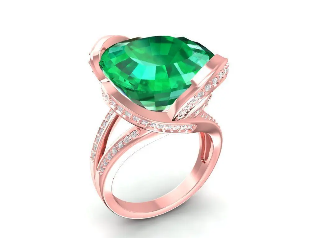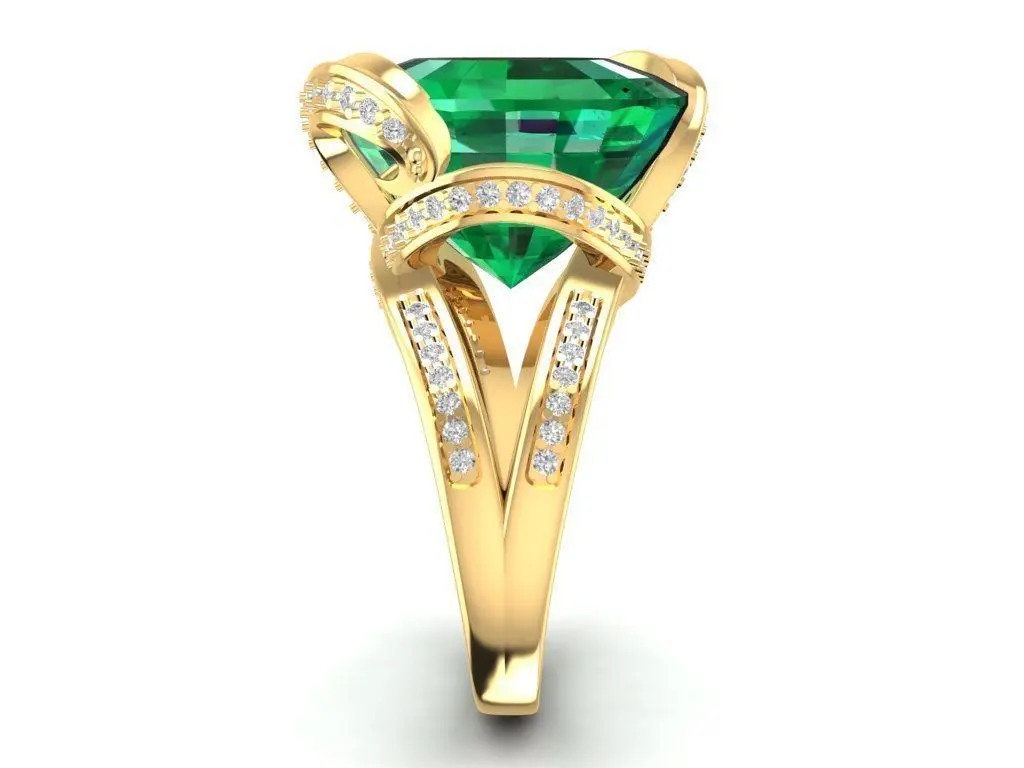 This 3D jewelry model presents a luxurious emerald gemstone ring for women, designed with an elegant cross-over shank and a bold center stone. The main emerald-cut gem radiates vibrant green brilliance, held by fine prongs that elevate its beauty. The double crossover band is lined with pavé diamonds, creating a balanced harmony between strength and grace.