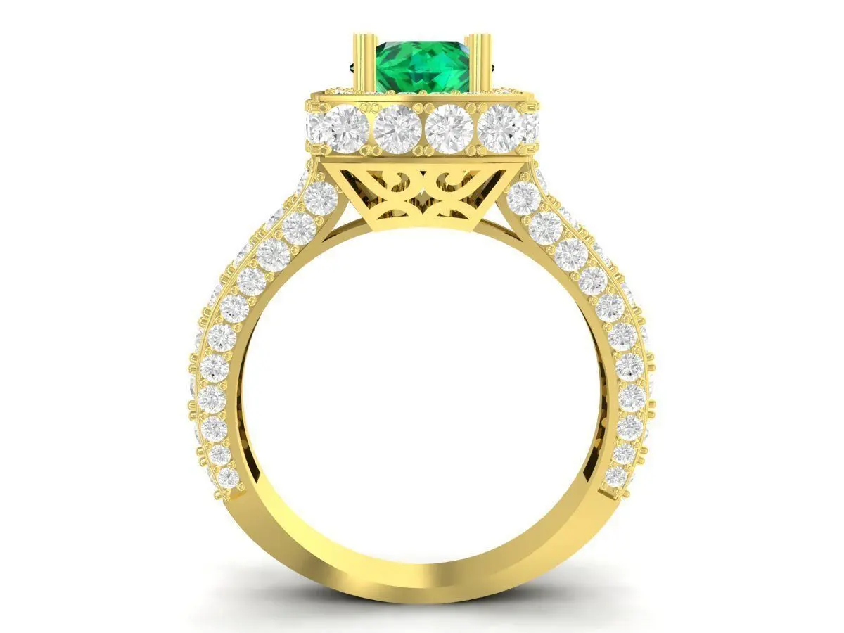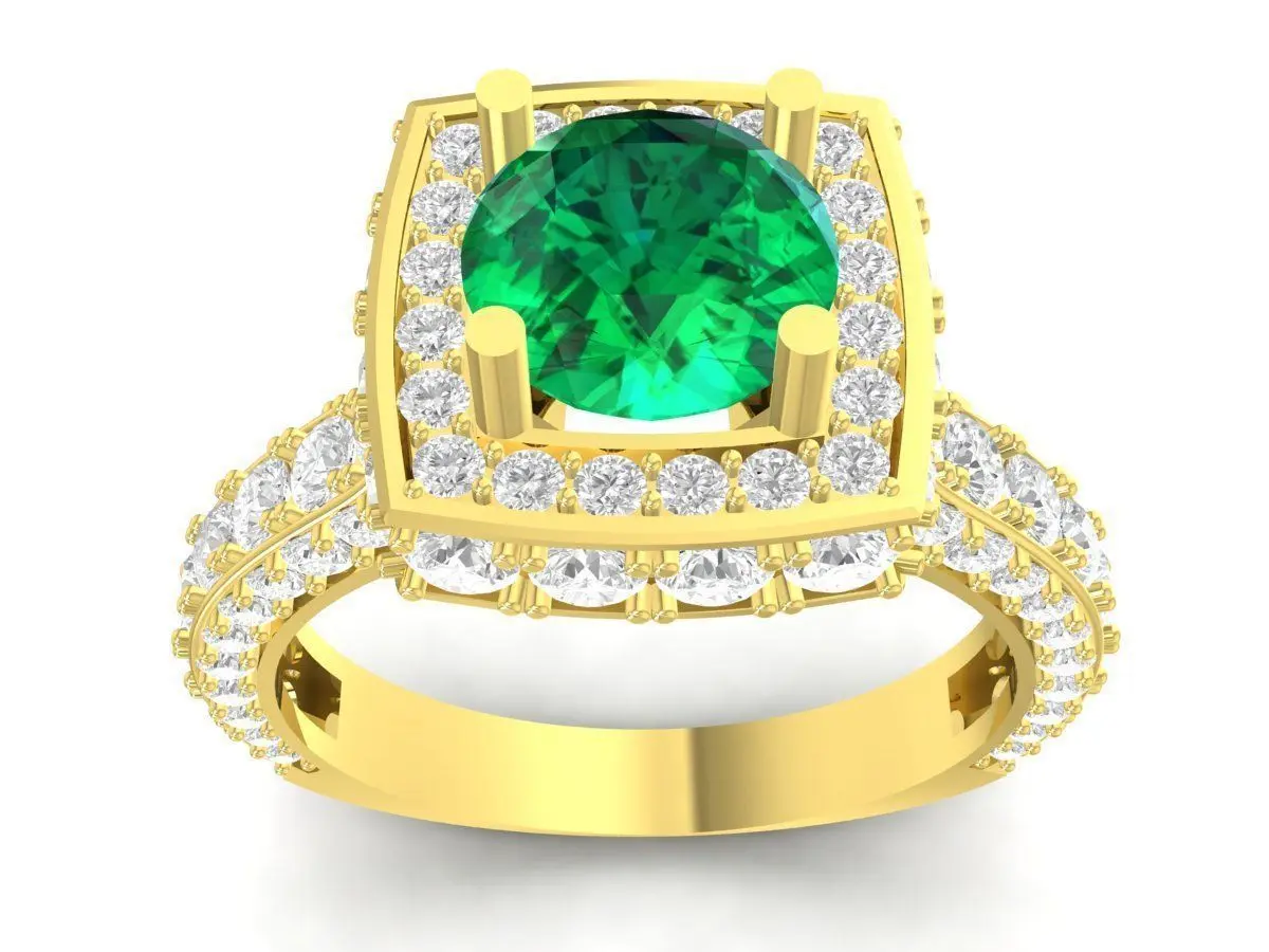 This 3D jewelry model showcases a luxury halo ring design featuring a round emerald-style center stone surrounded by brilliant accent stones. The square halo frame enhances the presence of the center stone while adding a bold and elegant visual balance.